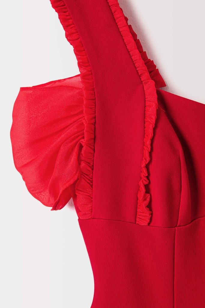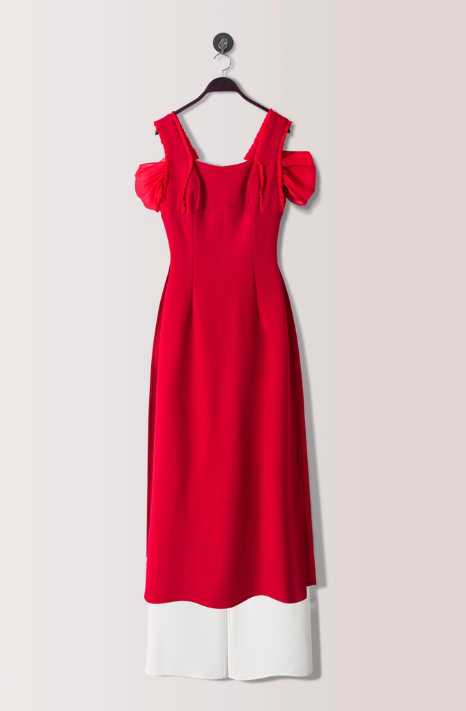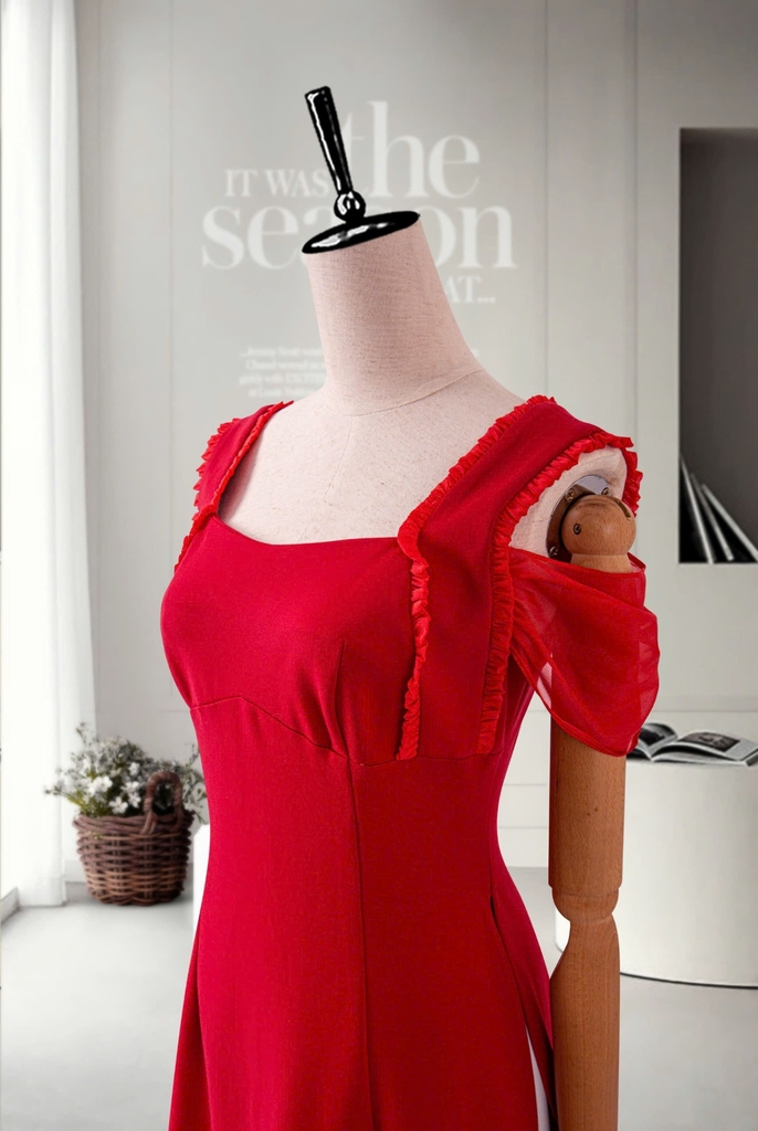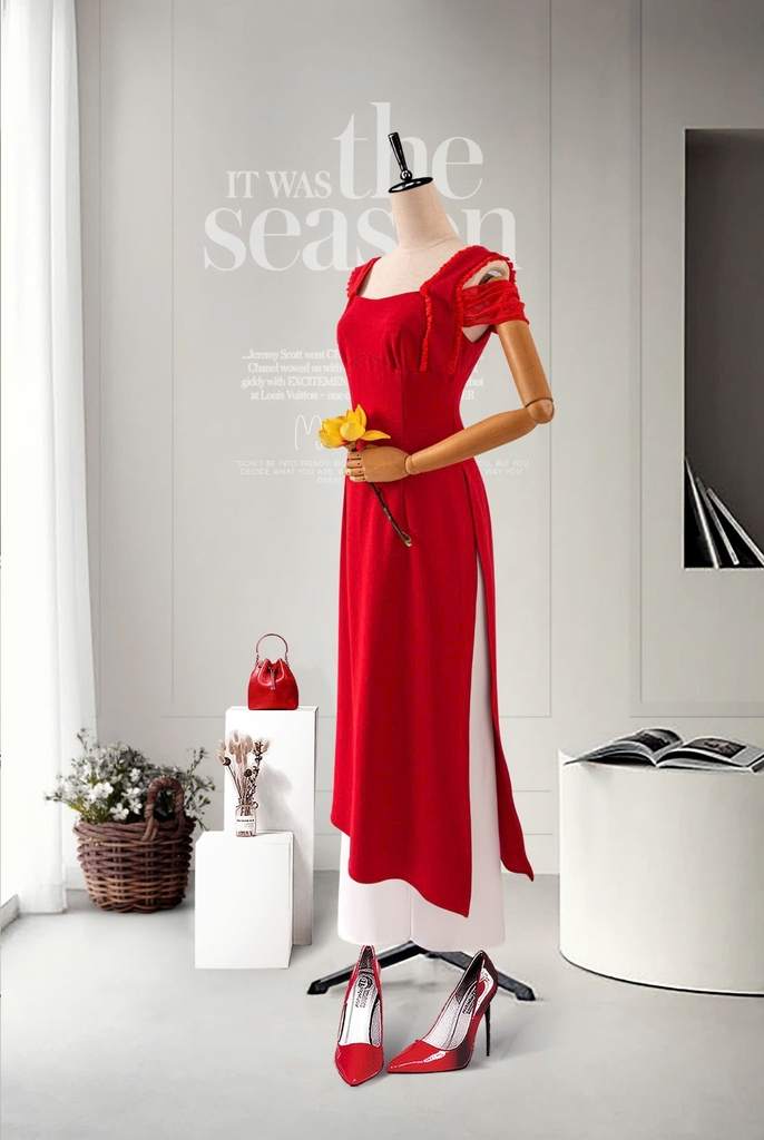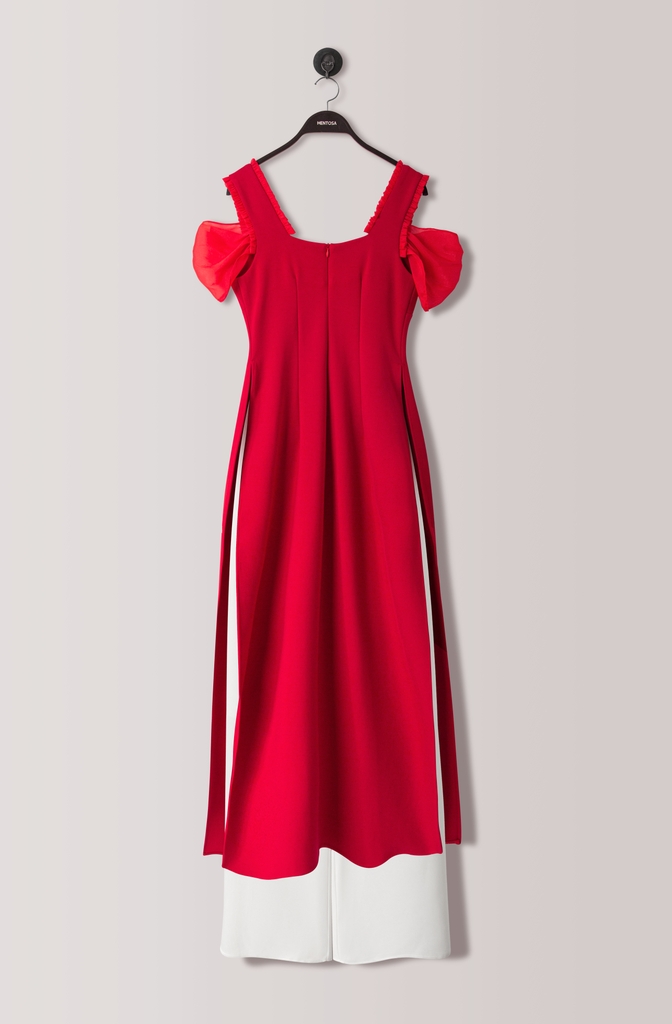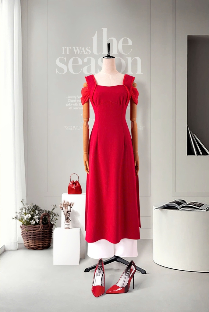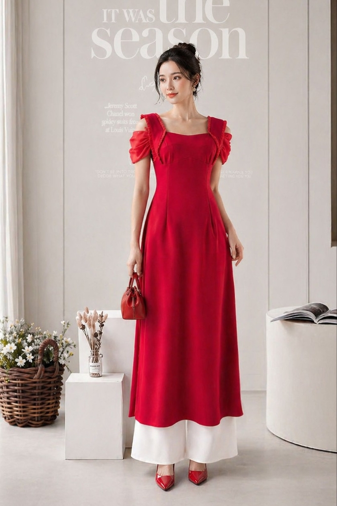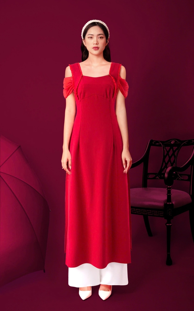 - Kiểu dáng: Áo dài cách tân, trễ vai phối bèo ánh kim, thanh lịch sang trọng