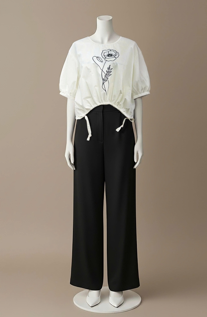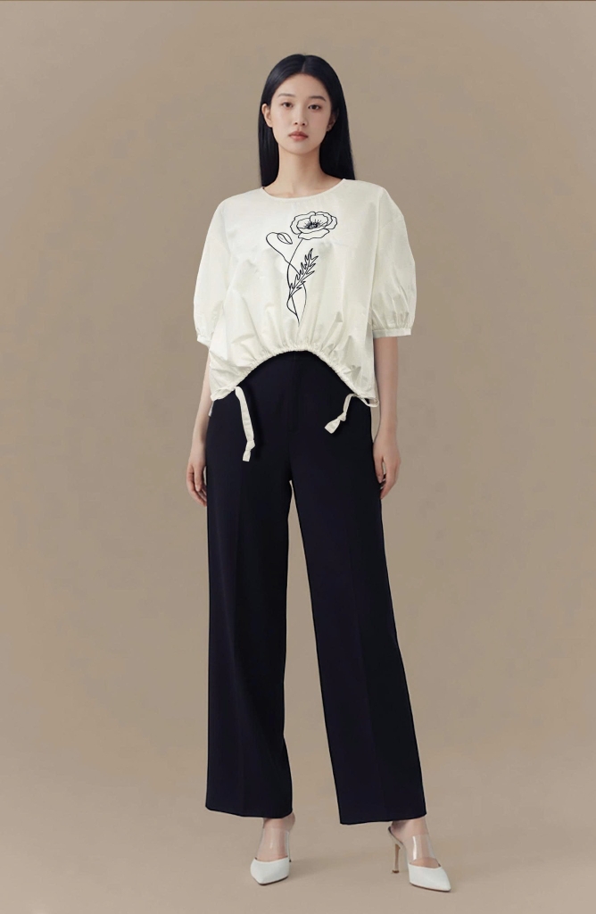 - Kiểu dáng: áo form rộng, tay phồng, lai áo rút dây