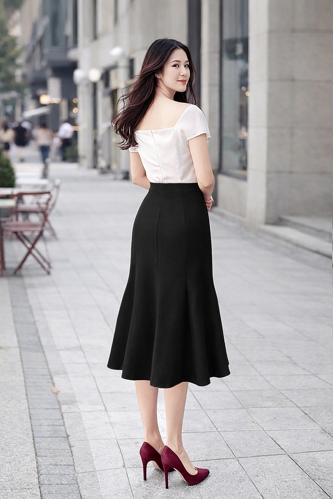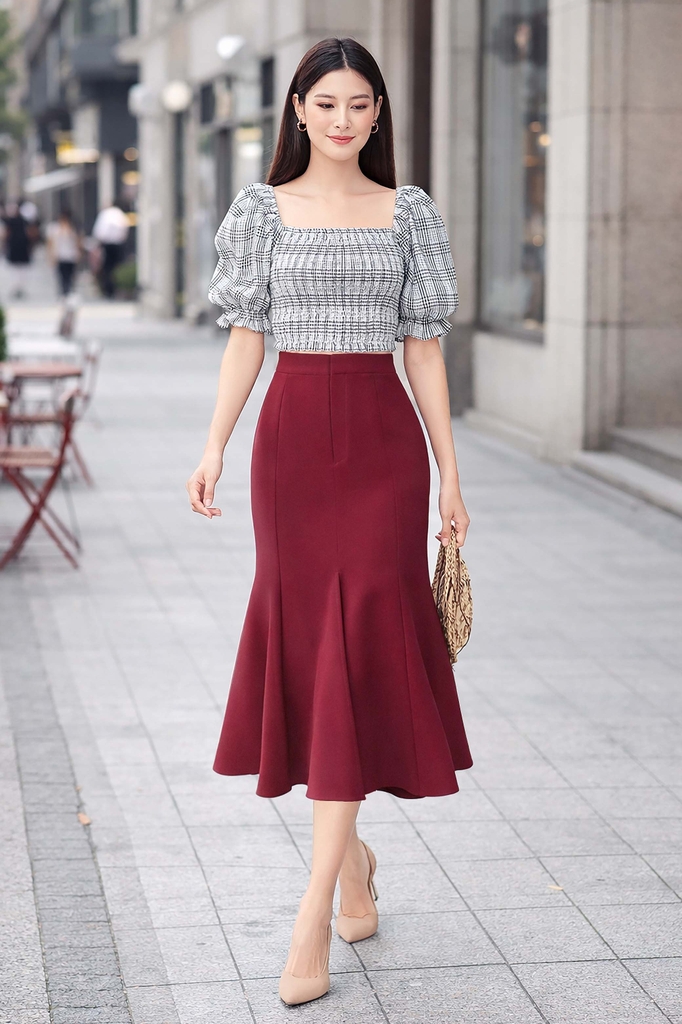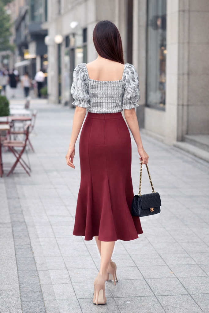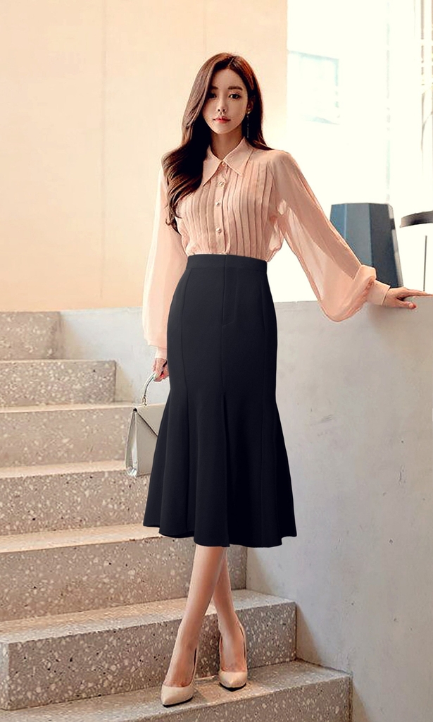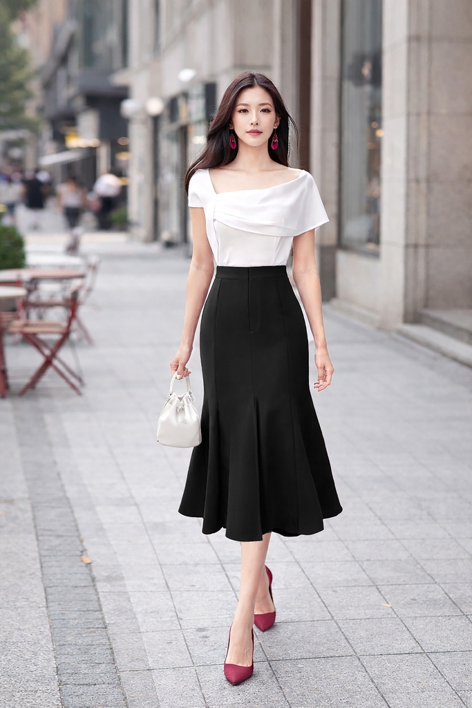 - Kiểu dáng: chân váy dáng đuôi cá, xẻ giữa
