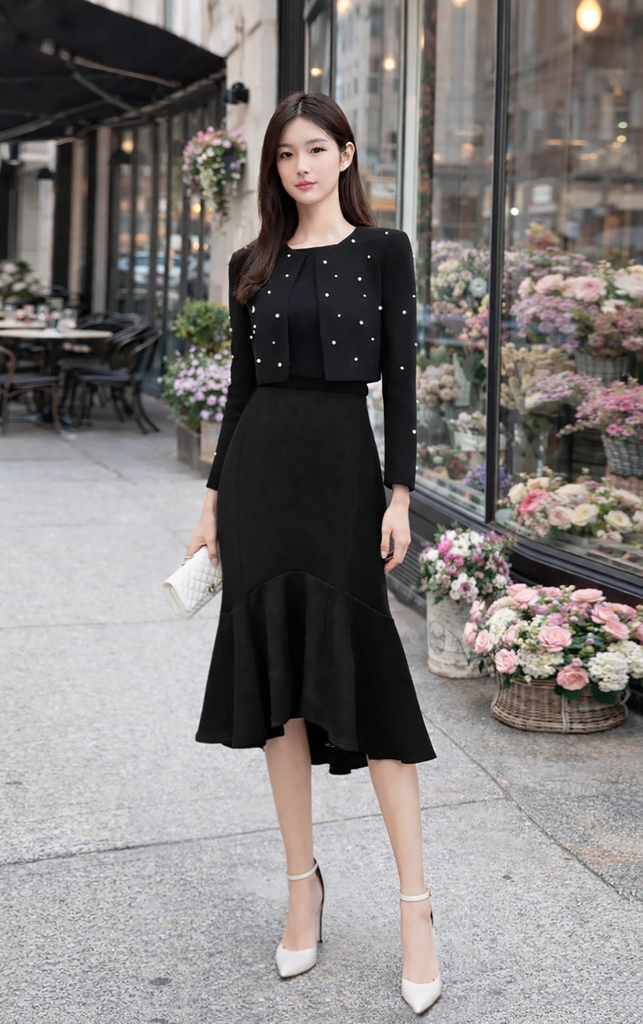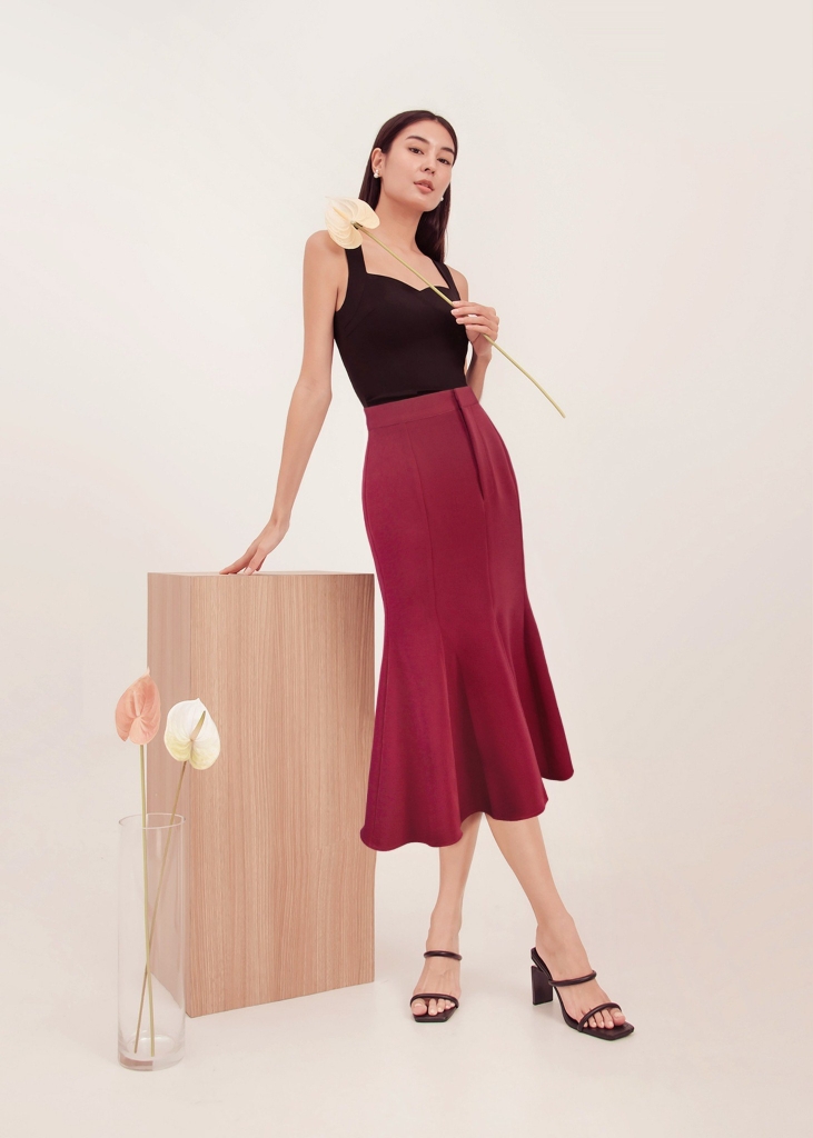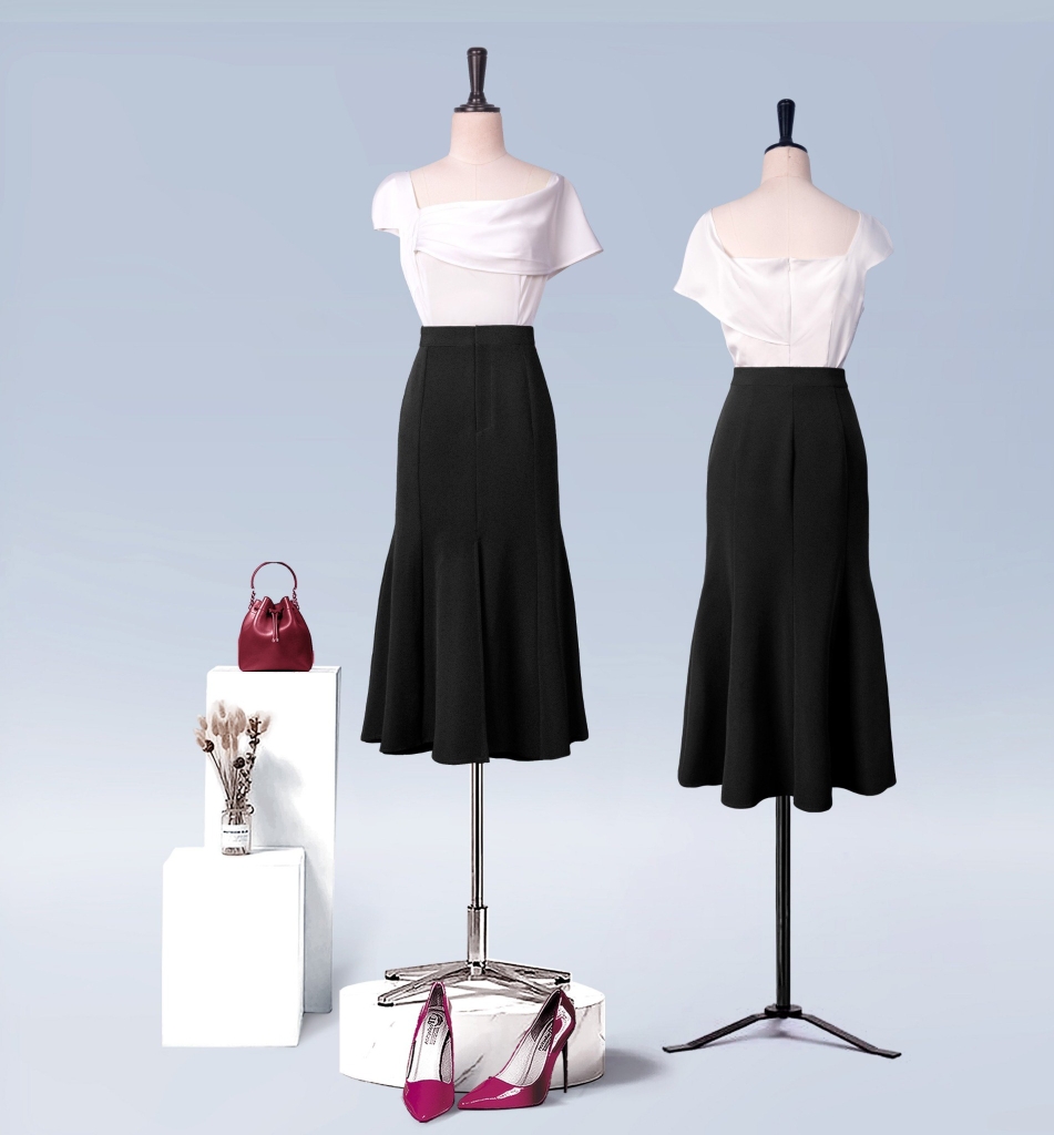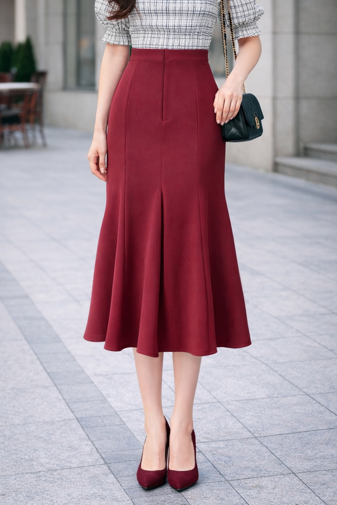 - Kiểu dáng: chân váy dáng đuôi cá, xẻ giữa