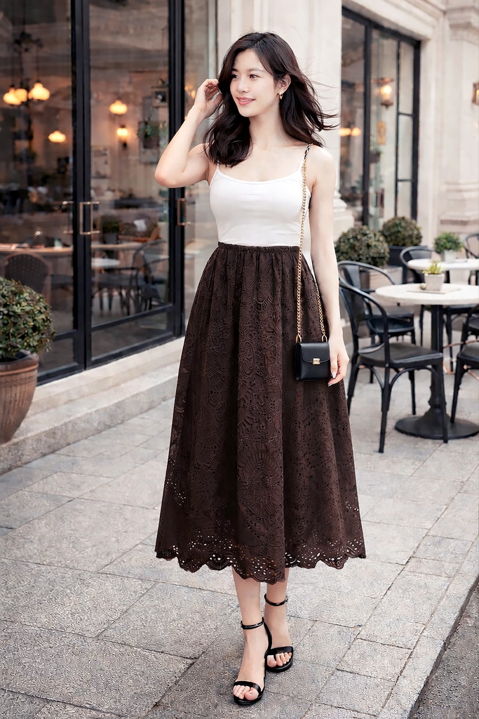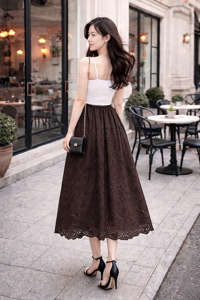 - Kiểu dáng: chân váy dài, xòe, lưng thun