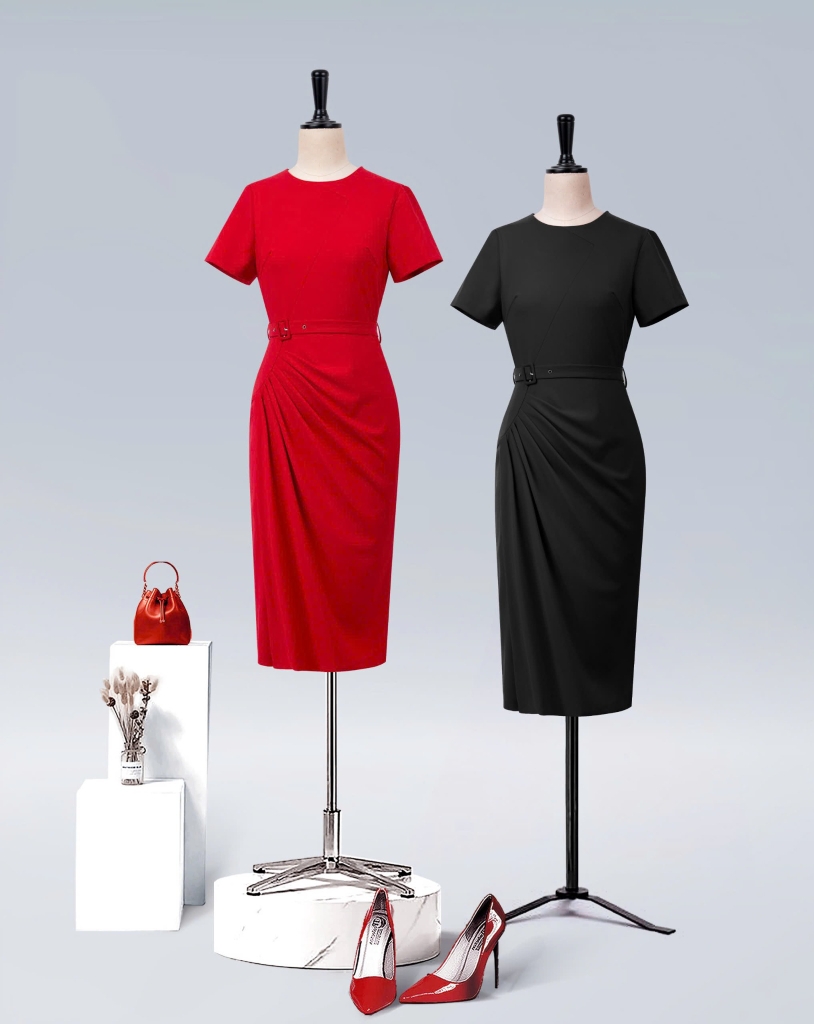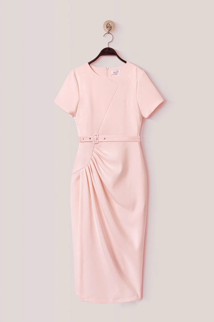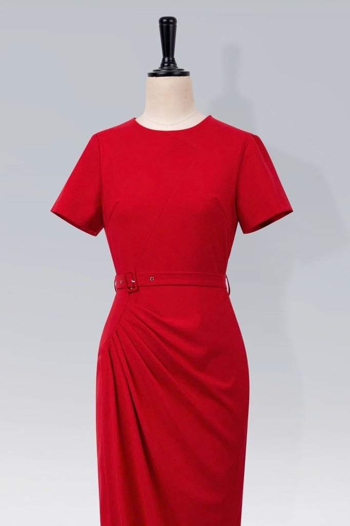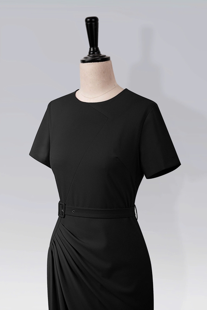 - Kiểu dáng: Đầm tùng xếp ly, tay con cổ tròn, phom bút trì có kèm day belt đóng mắc cáo
