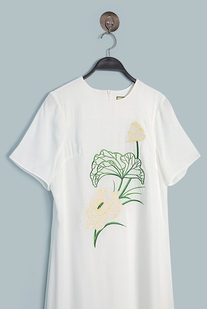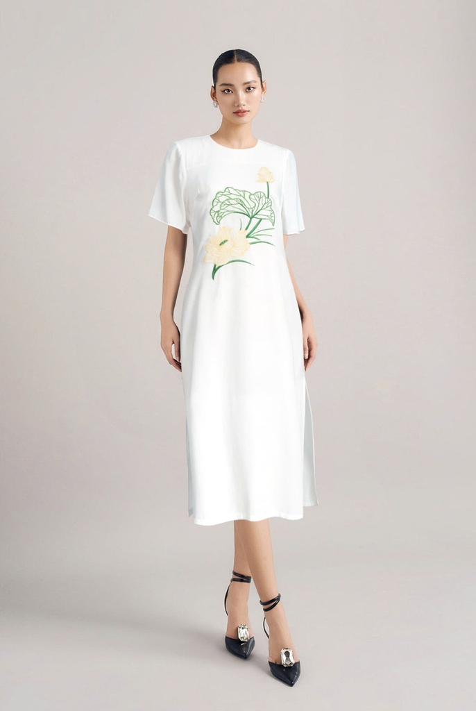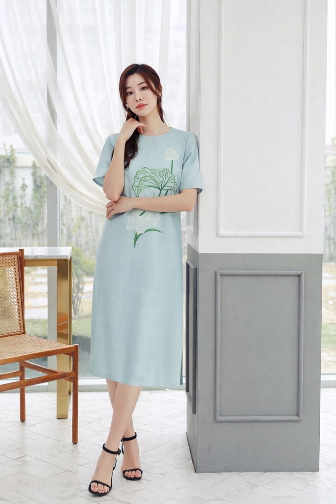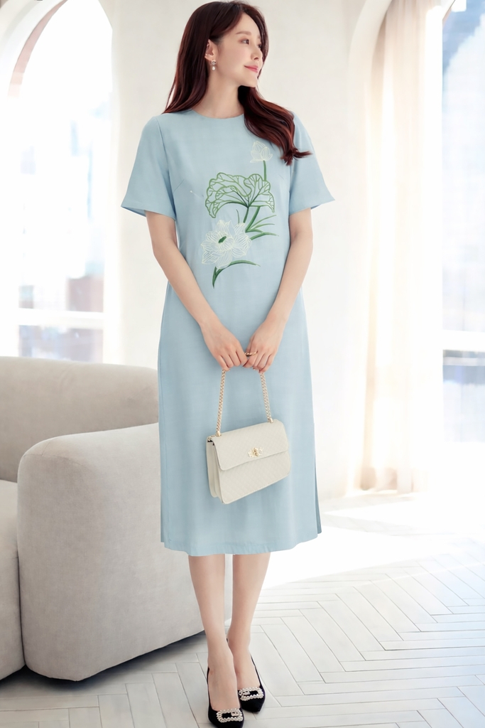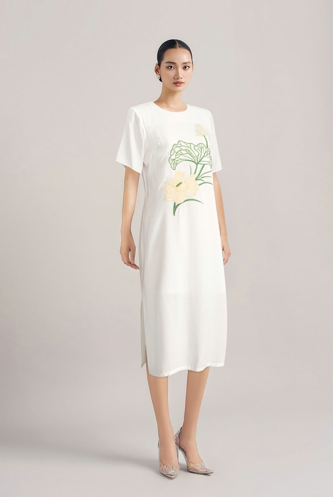 - Kiểu dáng: Đầm cổ tròn, tay con, phom suông