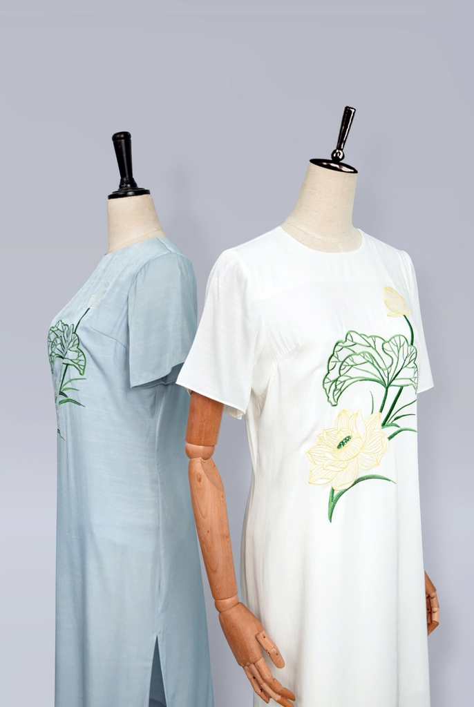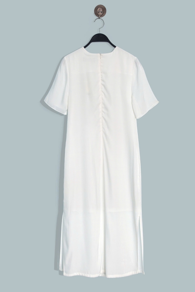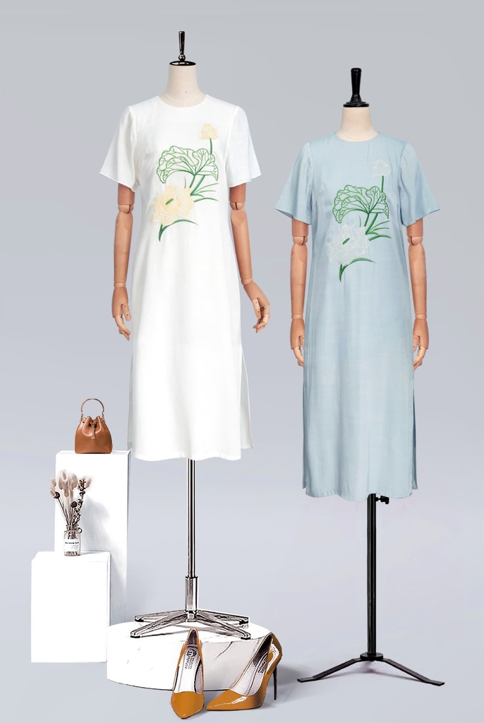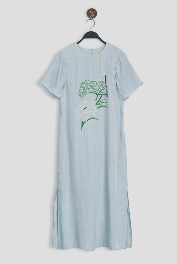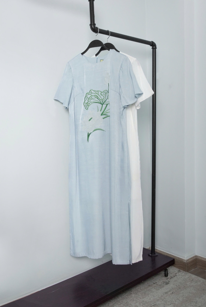 - Kiểu dáng: Đầm cổ tròn, tay con, phom suông