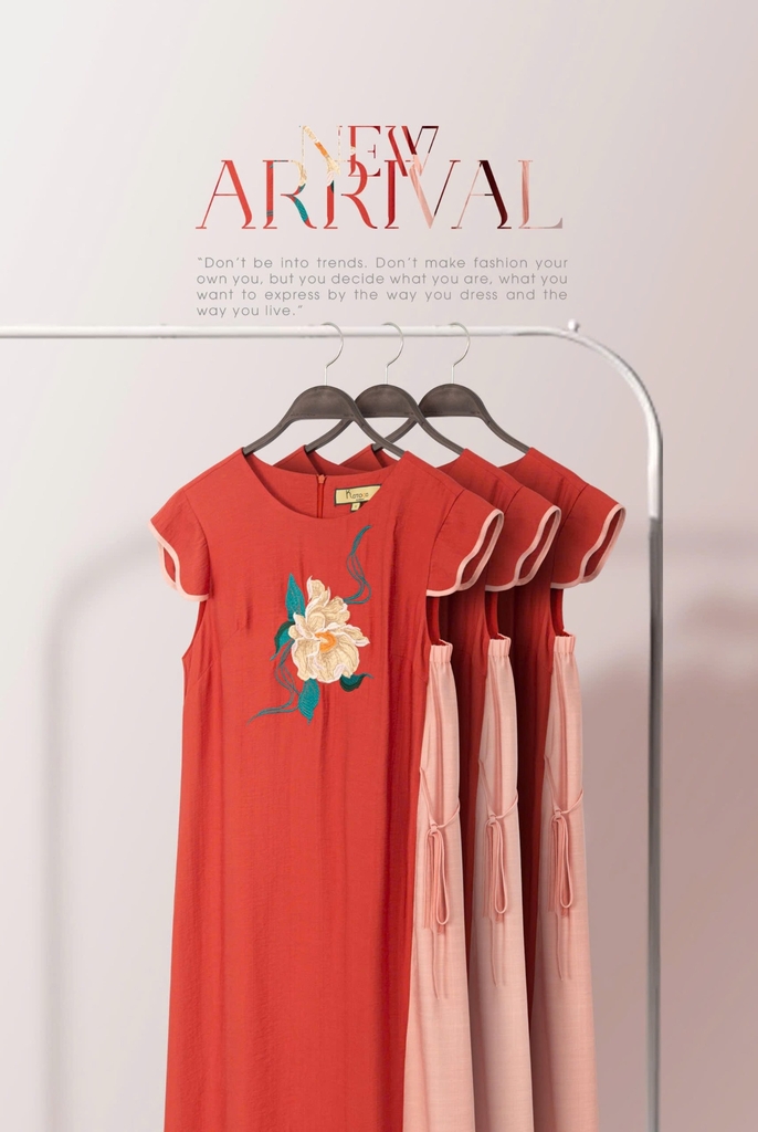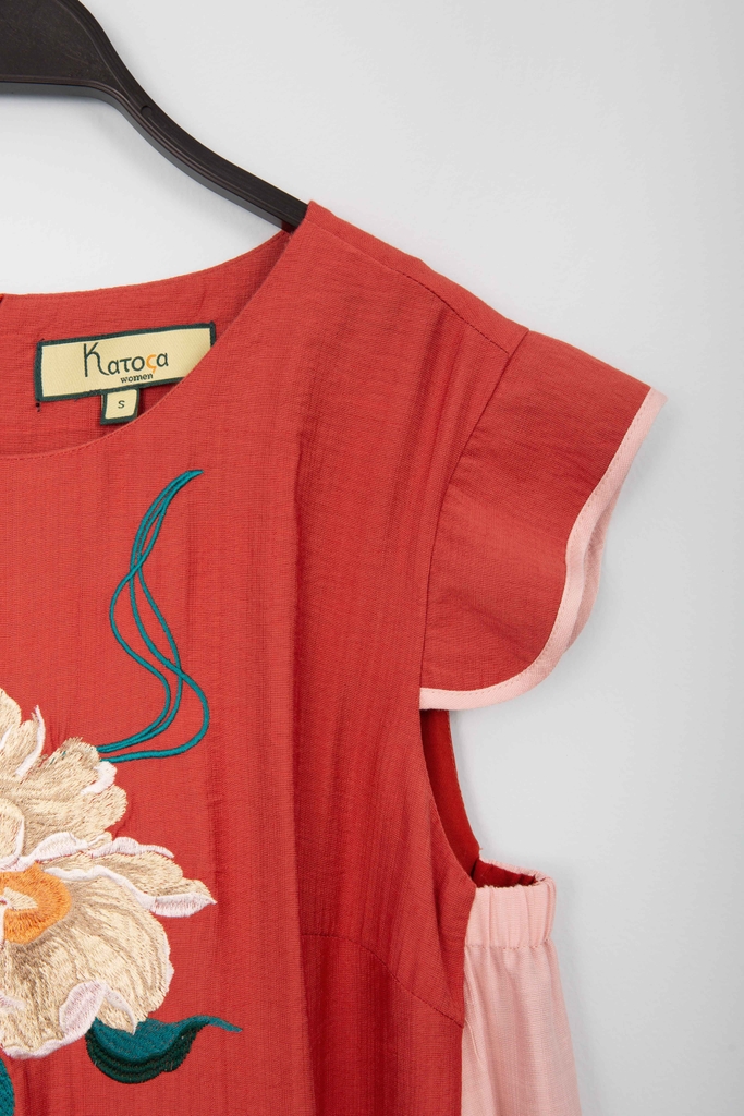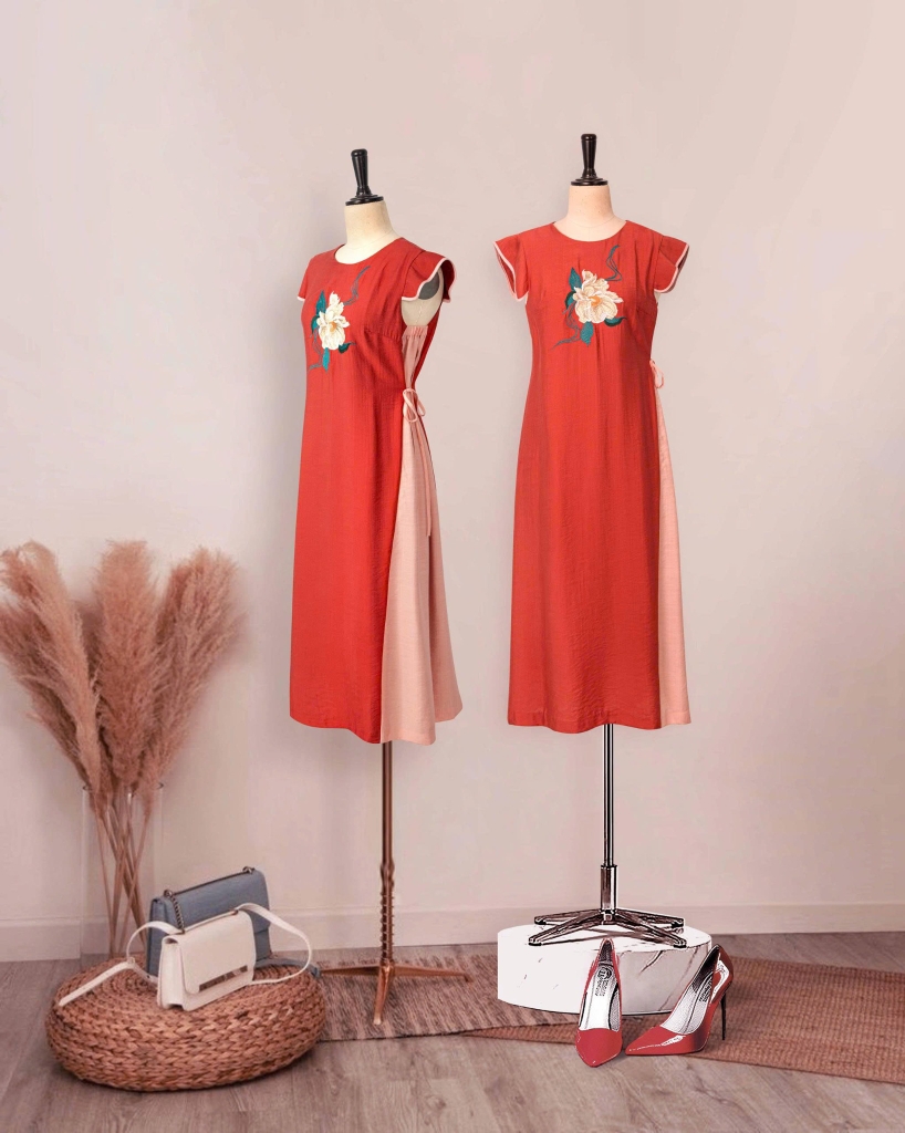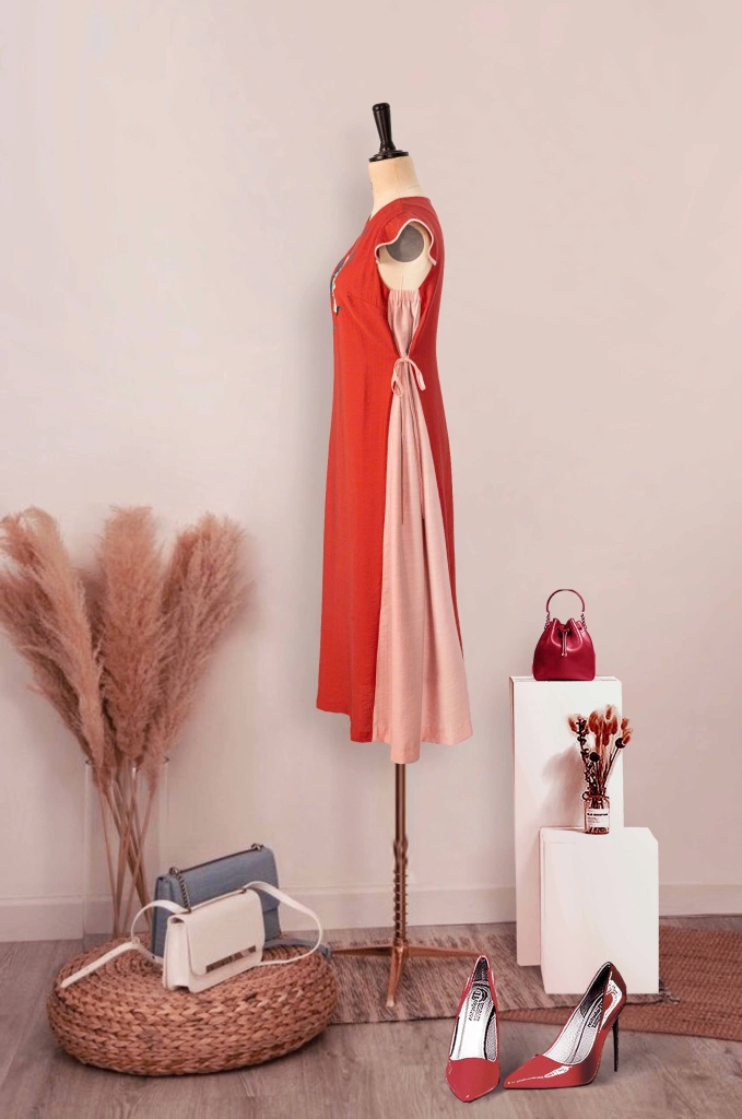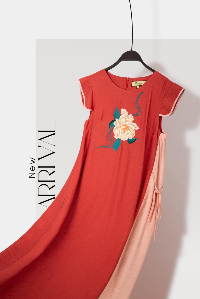 - Kiểu dáng: Đầm phôm rộng phối màu, họa tiết kế thêu trang trí