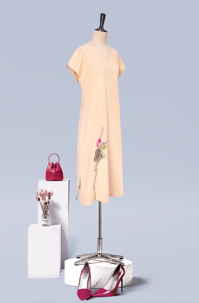 - Kiểu dáng: Đầm form rộng cổ V, tay hến, xẻ tà hai bên