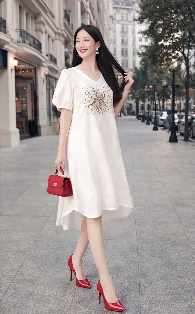 👉 Kiểu dáng: Kiểu dáng: Đầm linen phôm rộng, cổ V, họa tiết được thiết kế thêu hiện đại