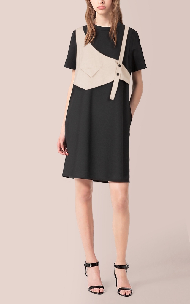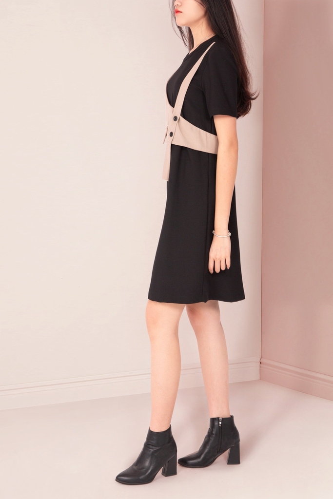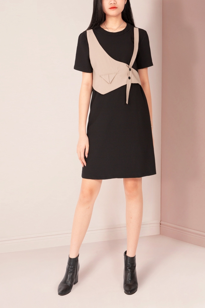 _ Màu sắc: đầm dên phối giả áo ghi lê màu da