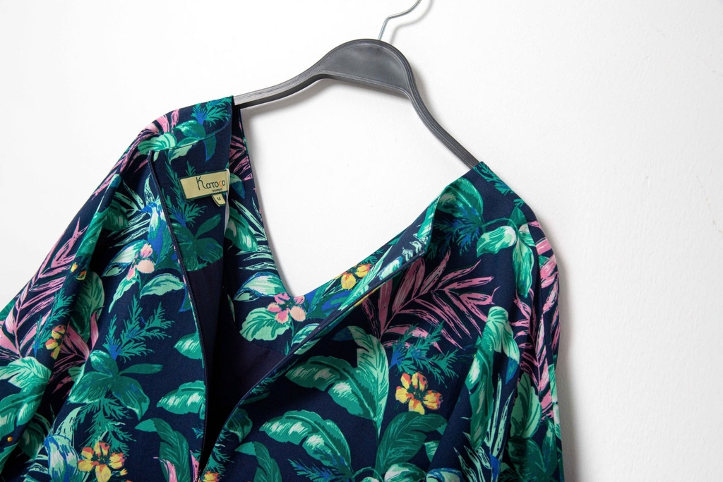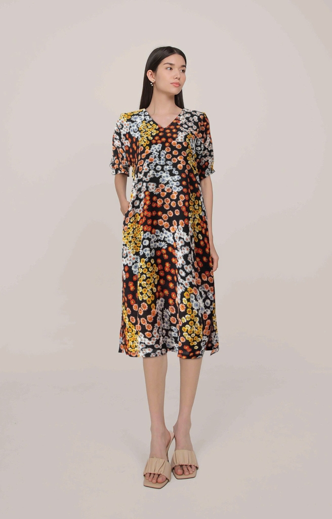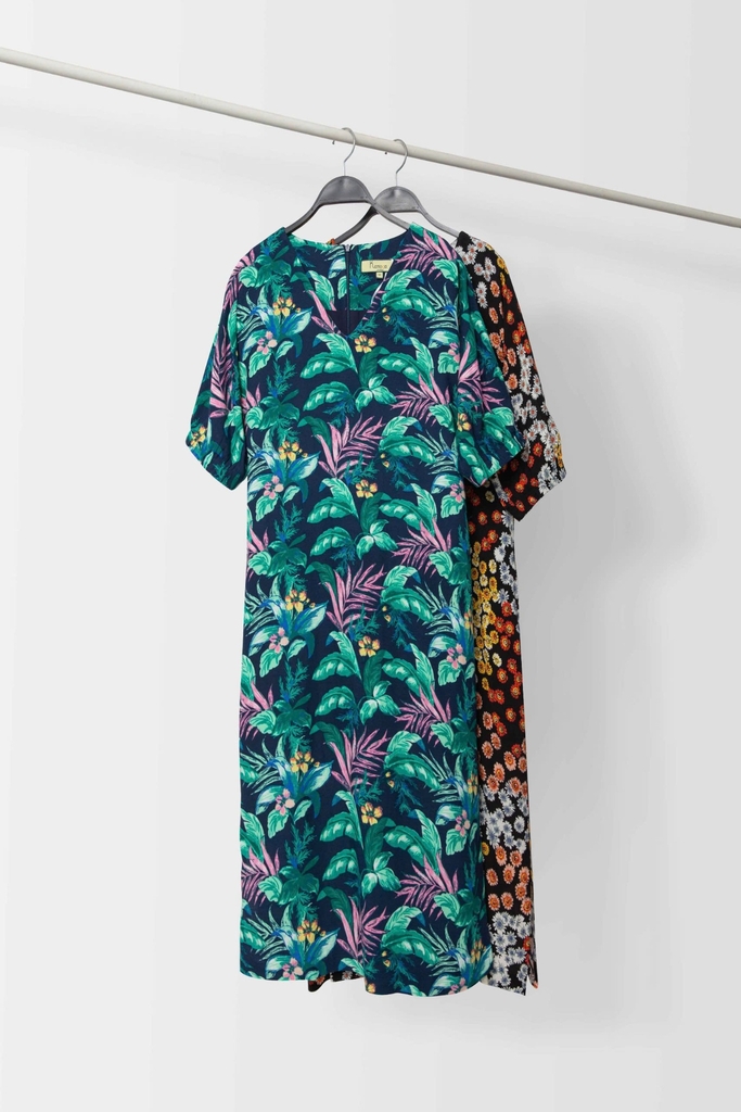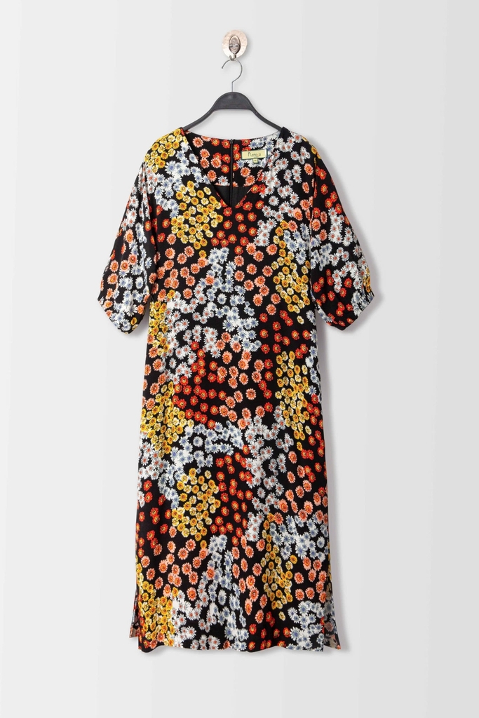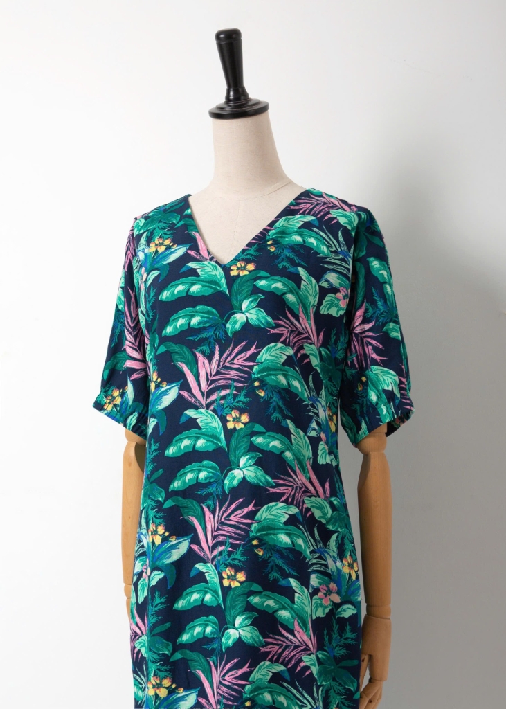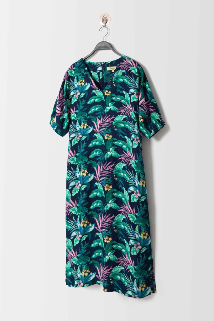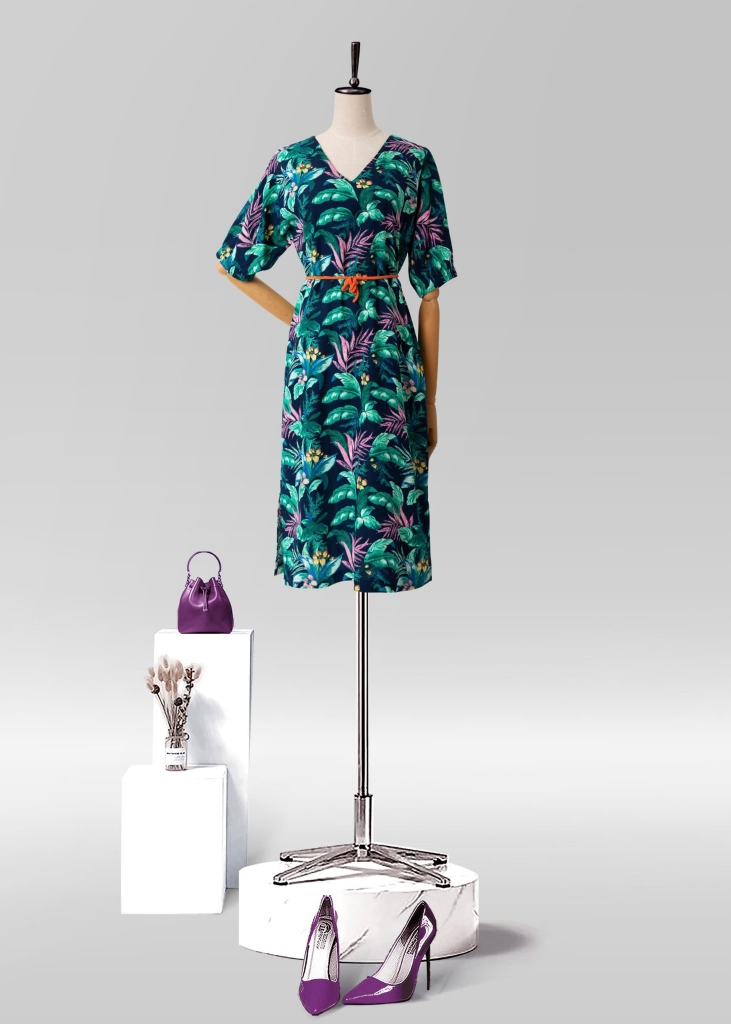 - Kiểu dáng: đầm form rộng cổ V, tay liền, xẻ tà hai bên