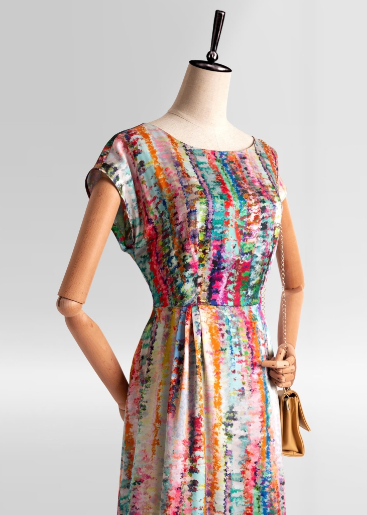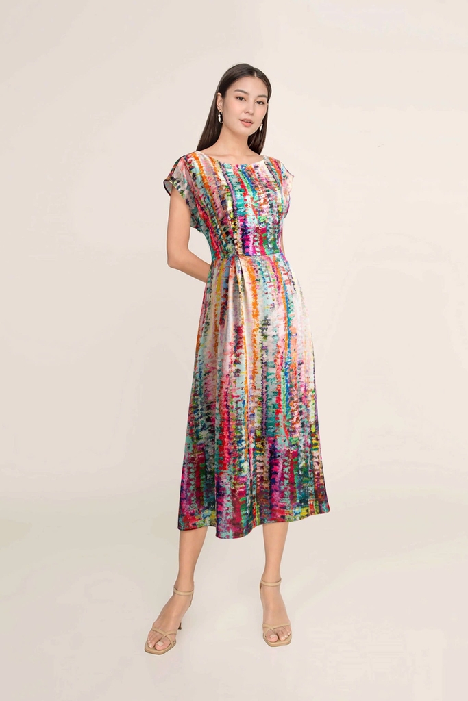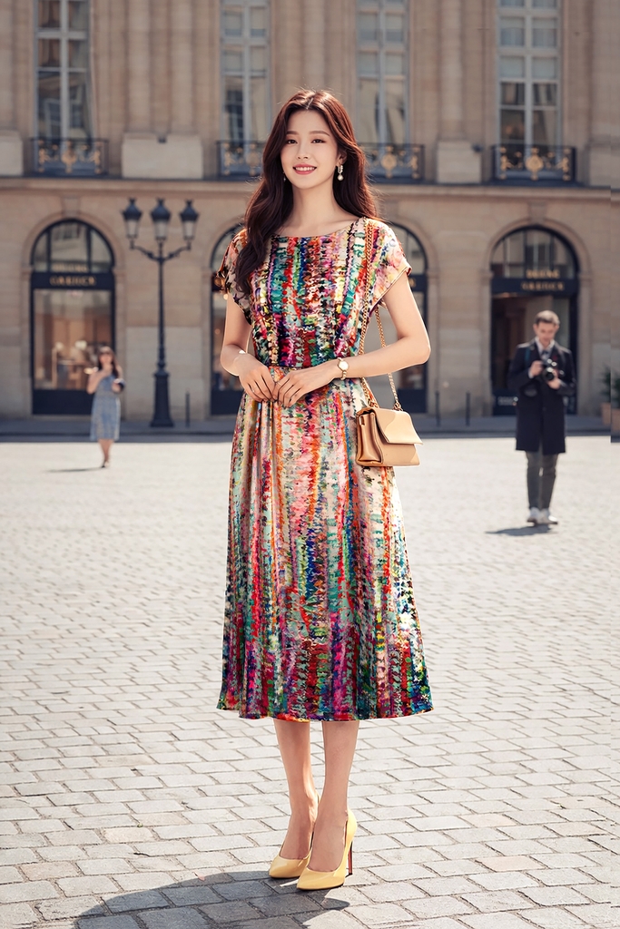 - Kiểu dáng: đầm cổ tròn, tùng xòe, tay hến