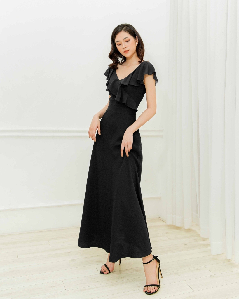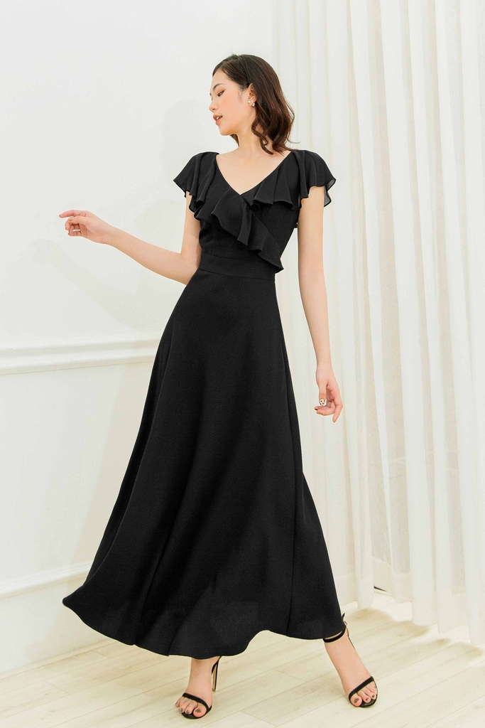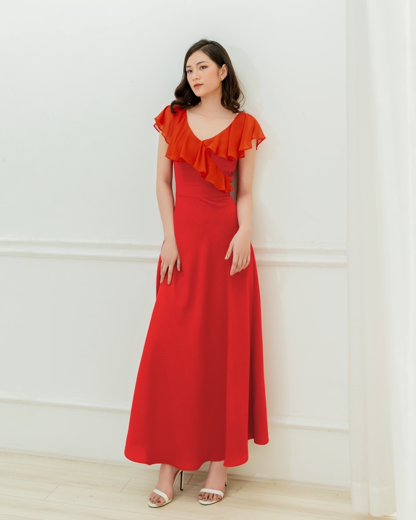 Miêu tả: Form đầm chuẩn, tôn dáng, thiết kế cổ V hiện đại, nhấn bèo nhẹ nhàng làm tăng thêm phần nữ tính.