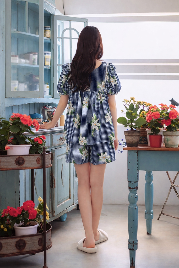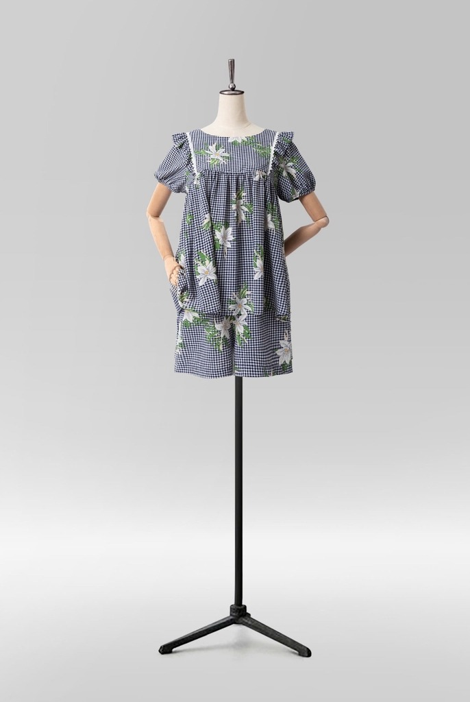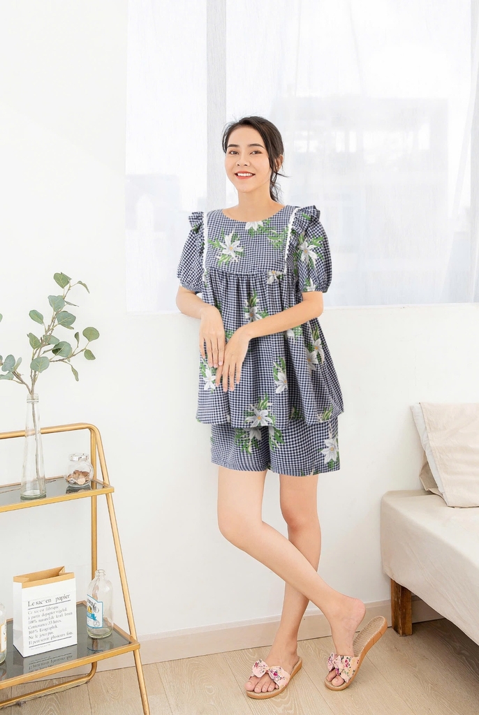- Kiểu dáng: Áo cổ tròn, tay ngắn, form rộng, quần ngắn, ống rộng, lưng thun