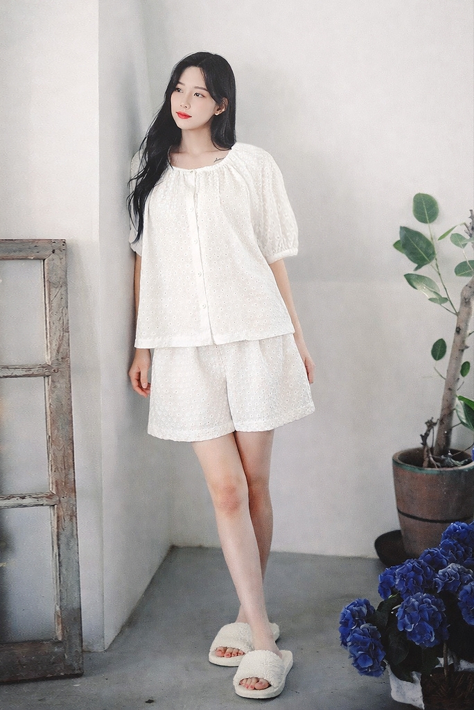 - Kiểu dáng: Set áo sơ mi cổ trụ, tay raplang, quần short, lưng chun