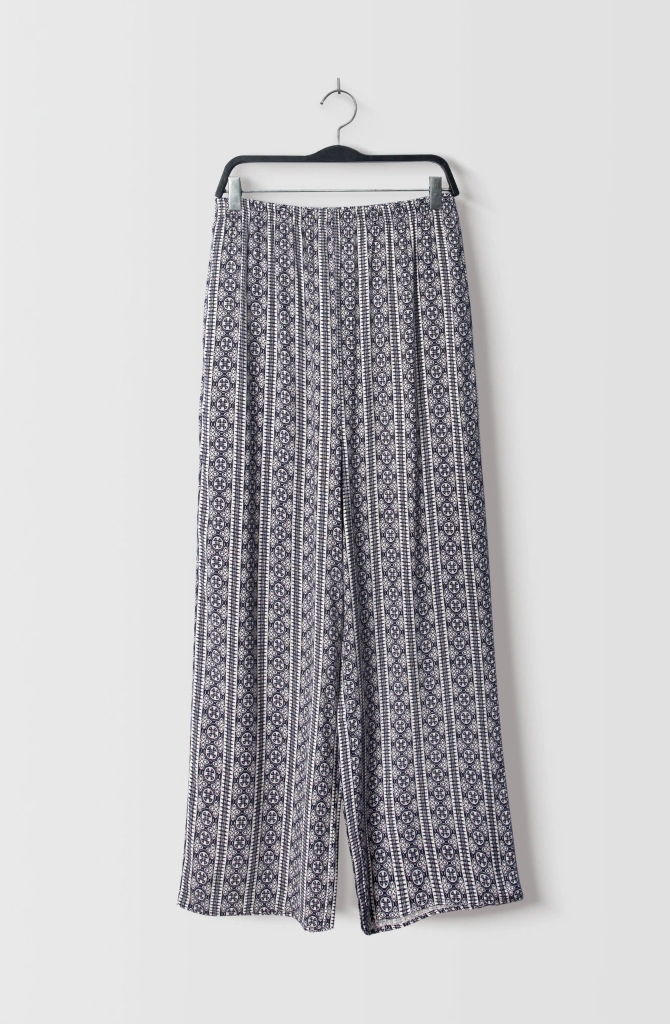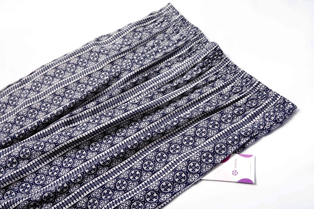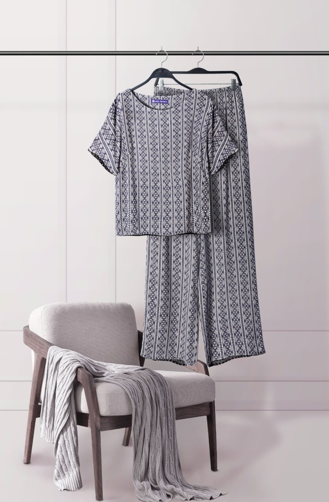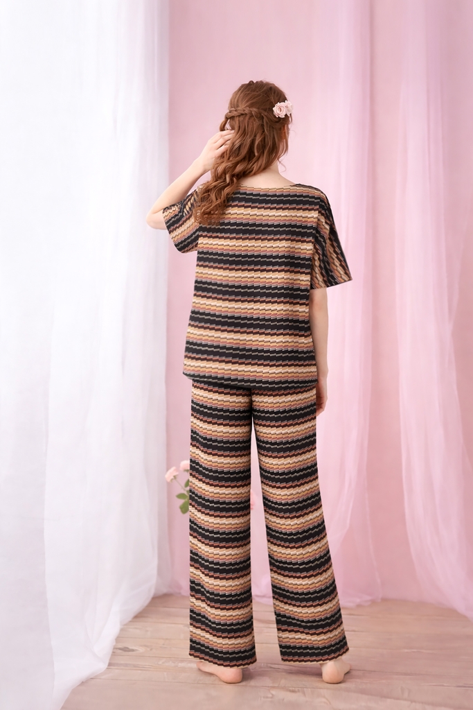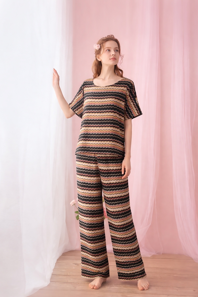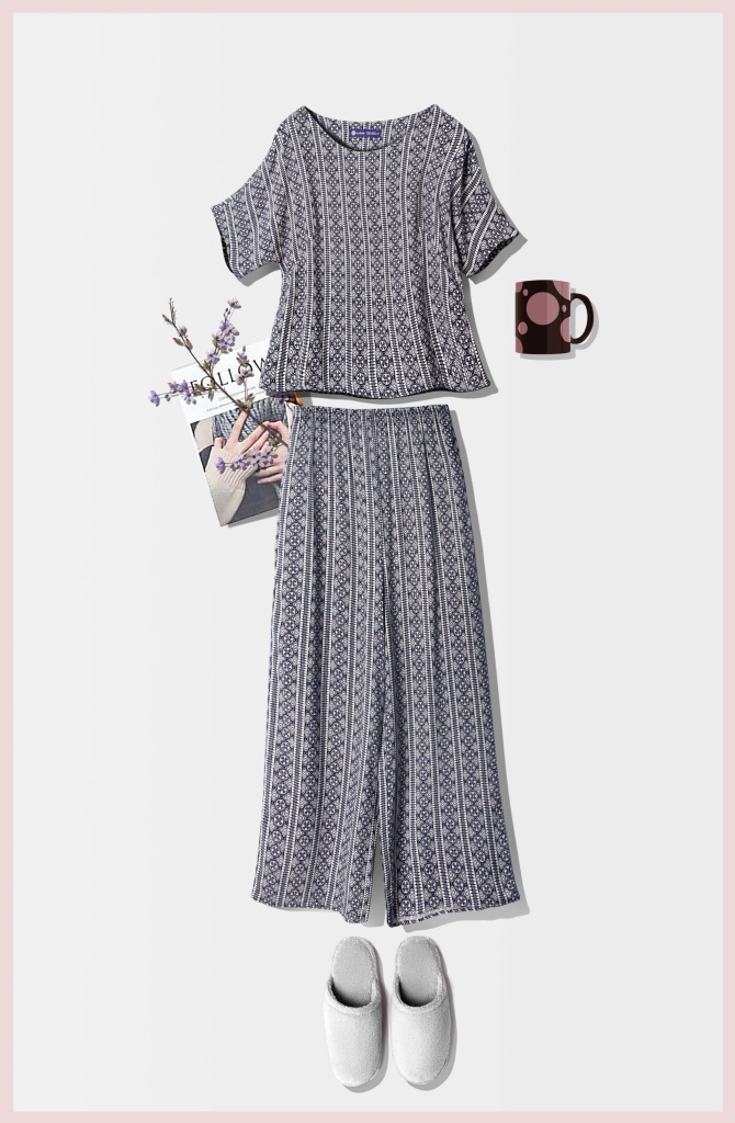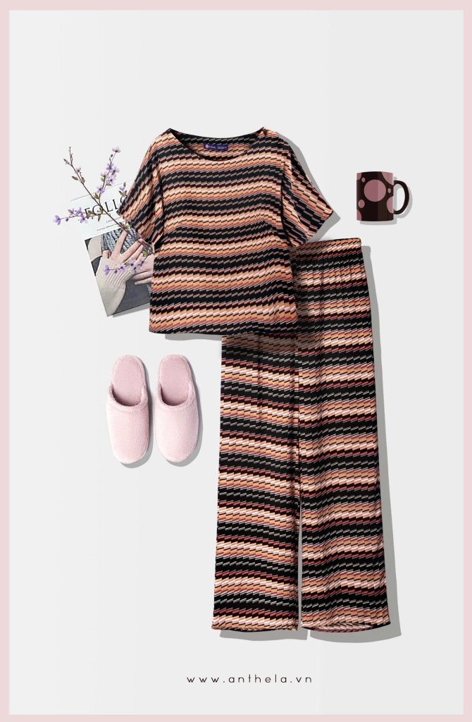 - Kiểu dáng: Áo cổ tròn tay liền, quần dài ống rộng lưng thun