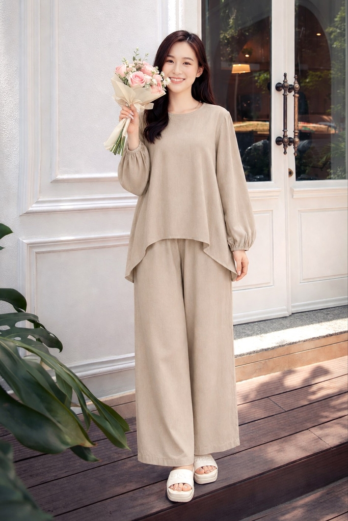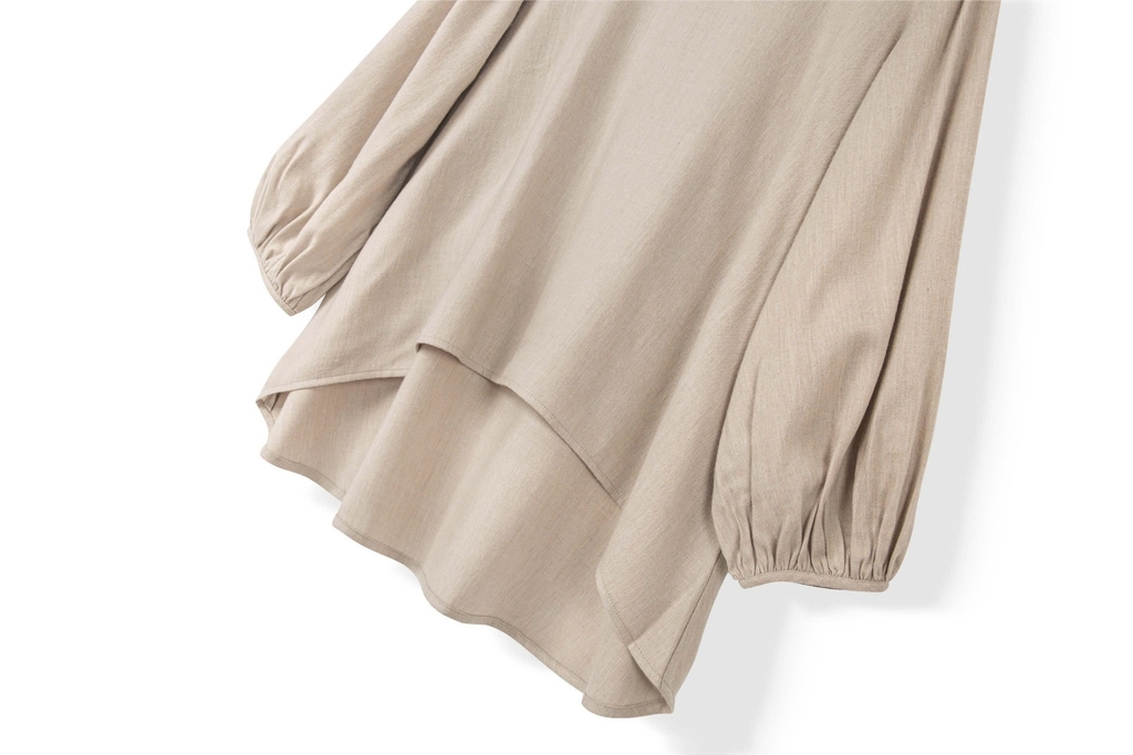 - Kiểu dáng: Áo cổ tròn, lai áo cao phần trước, dài phần thân sau, phom áo rộng, tay áo dài