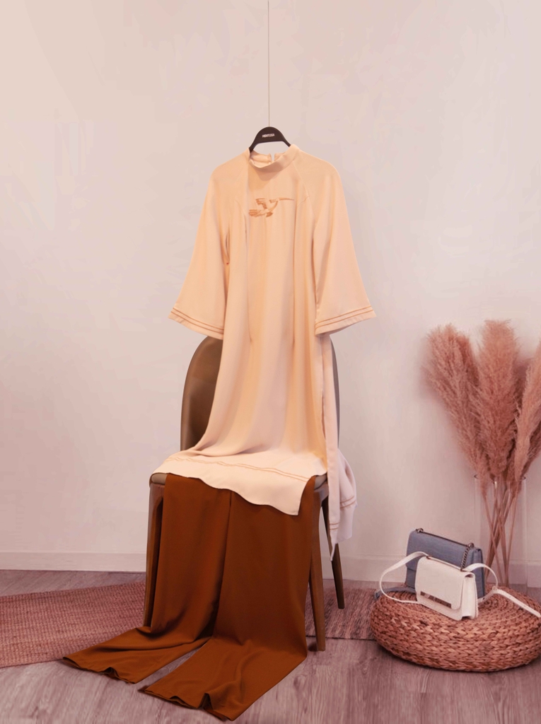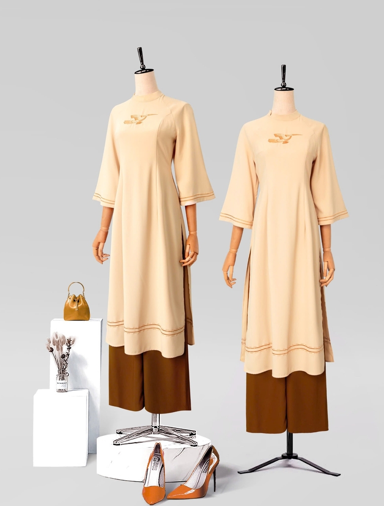 - Màu sắc: Áo màu kem da, quần màu nâu