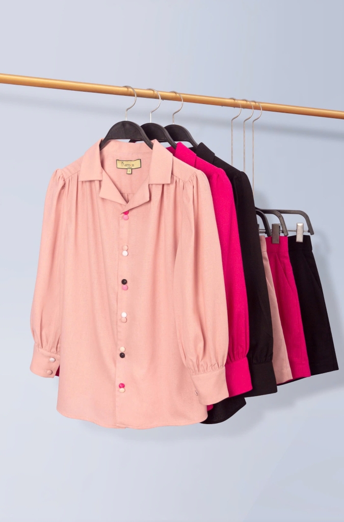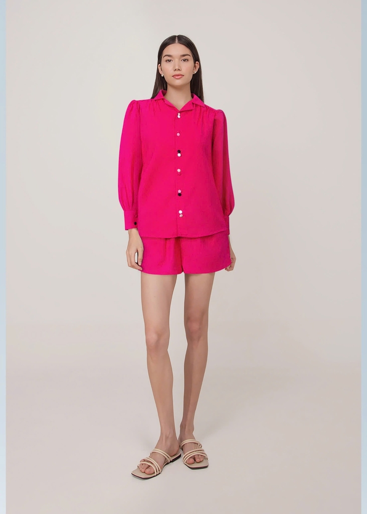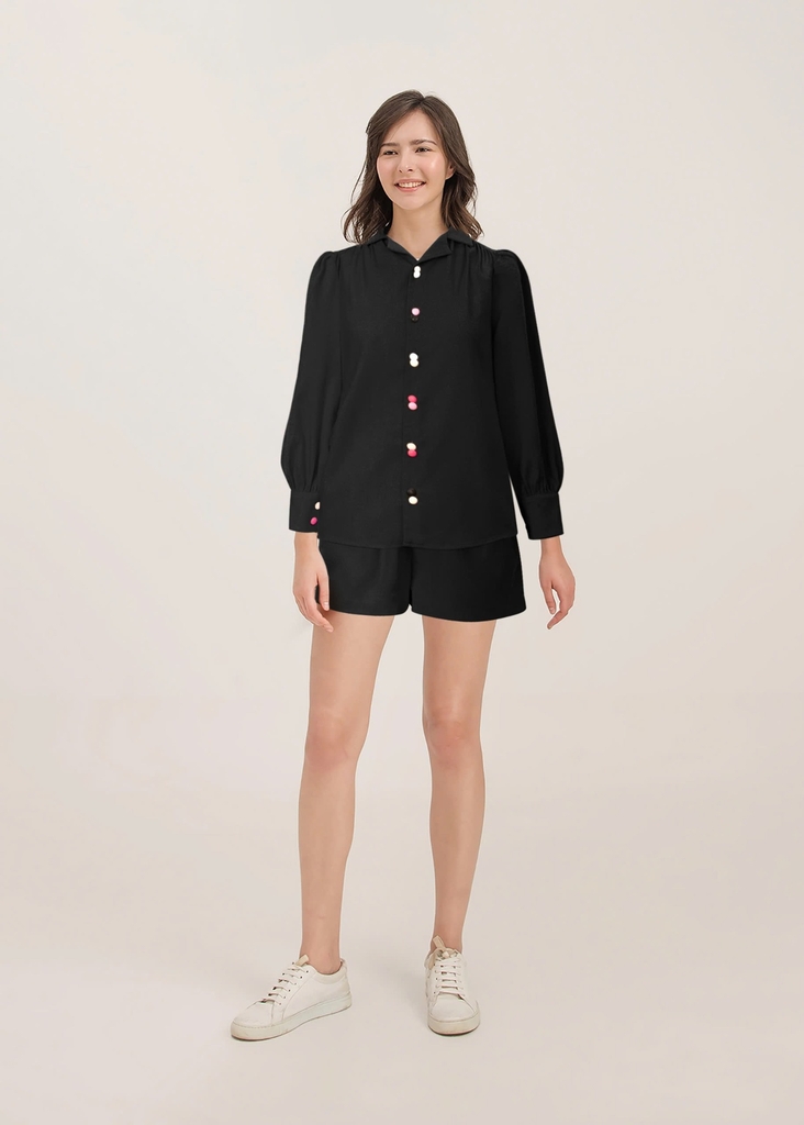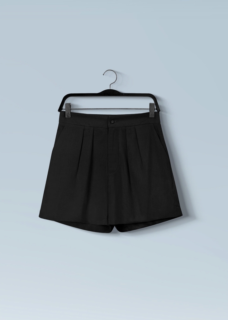 - Kiểu dáng: Áo sơmi cổ danton form rộng, quần đùi xếp ly
