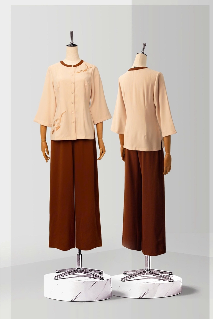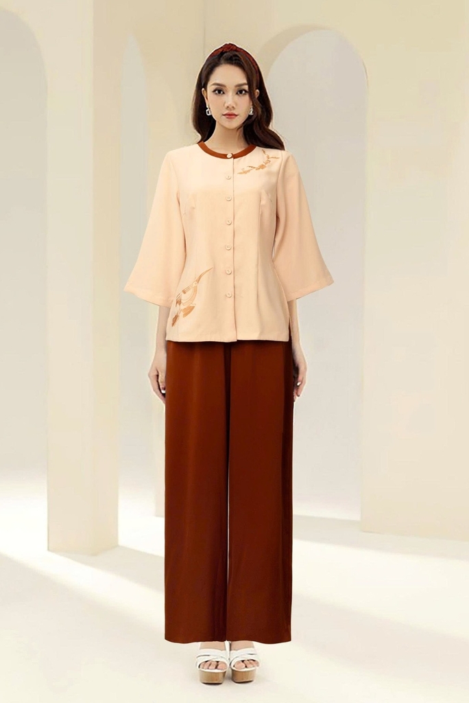 - Kiểu dáng: Áo cổ tròn, tay lửng, form ôm, quần dài, ống rộng, lưng thun