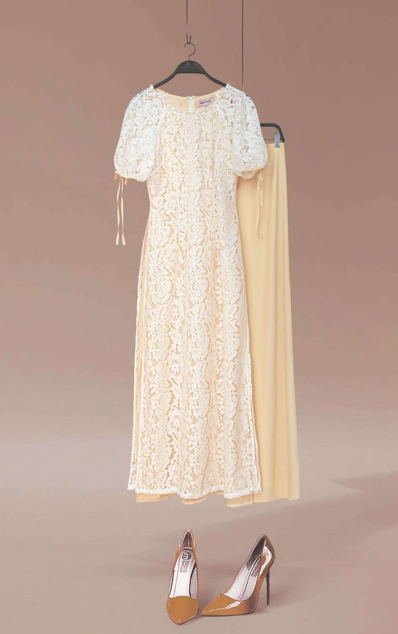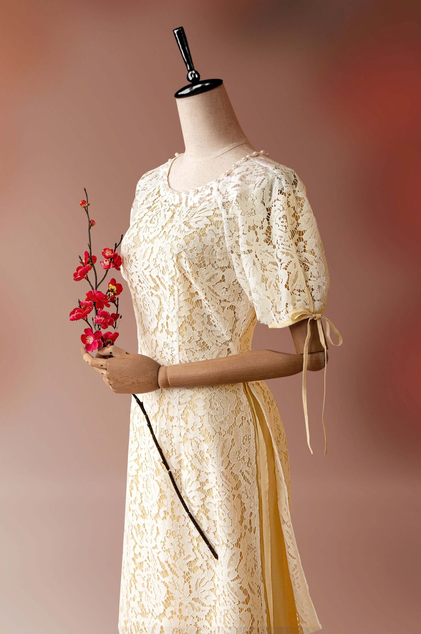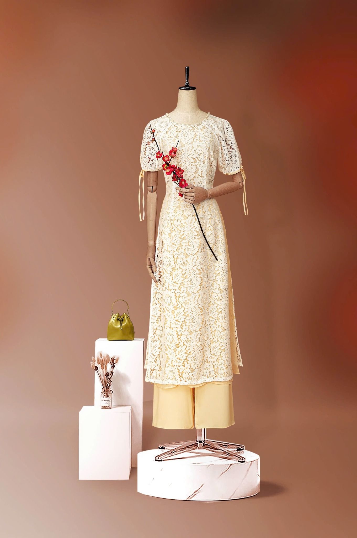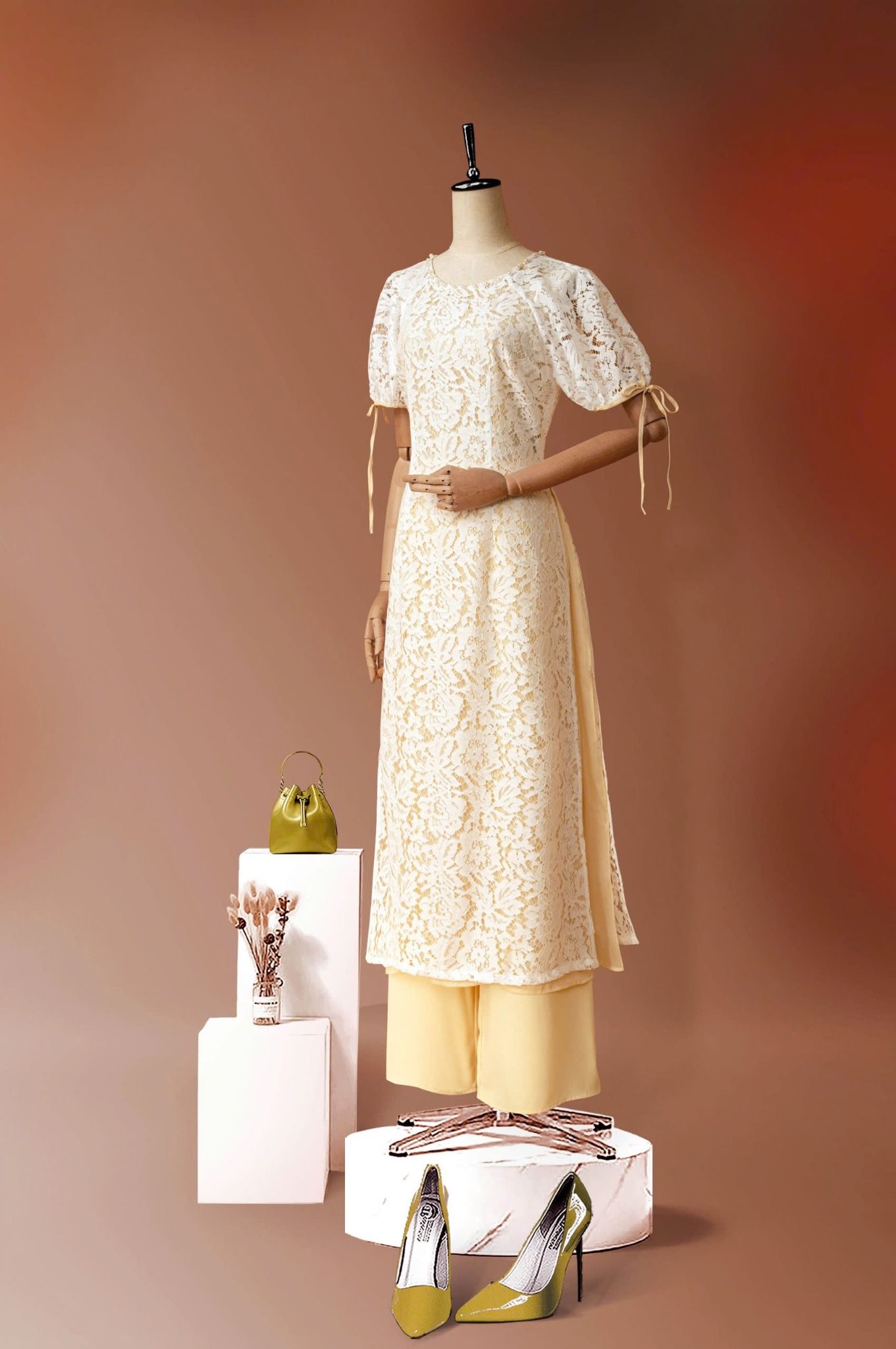 - Kiểu dáng: Áo dài ren đính kết ngọc trai thủ công tay áo phồng nhẹ quần thiết kế độc quần