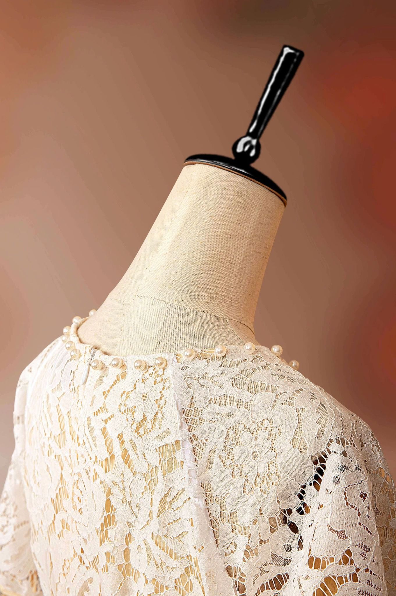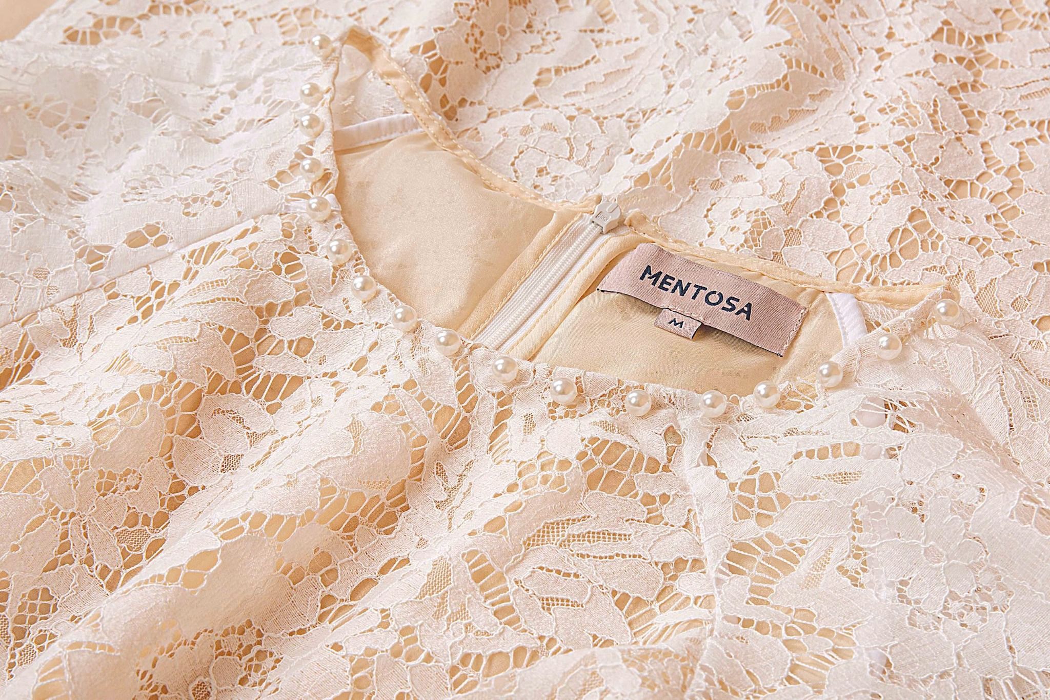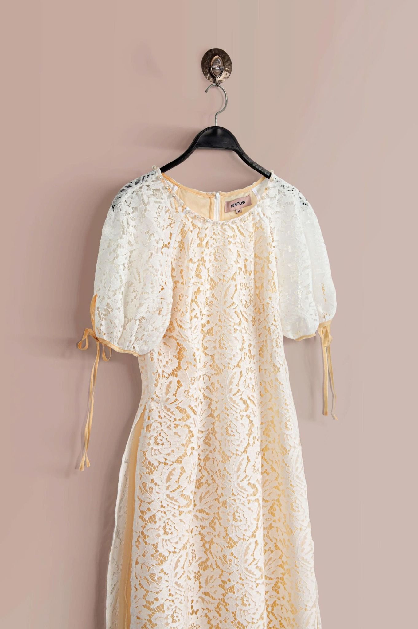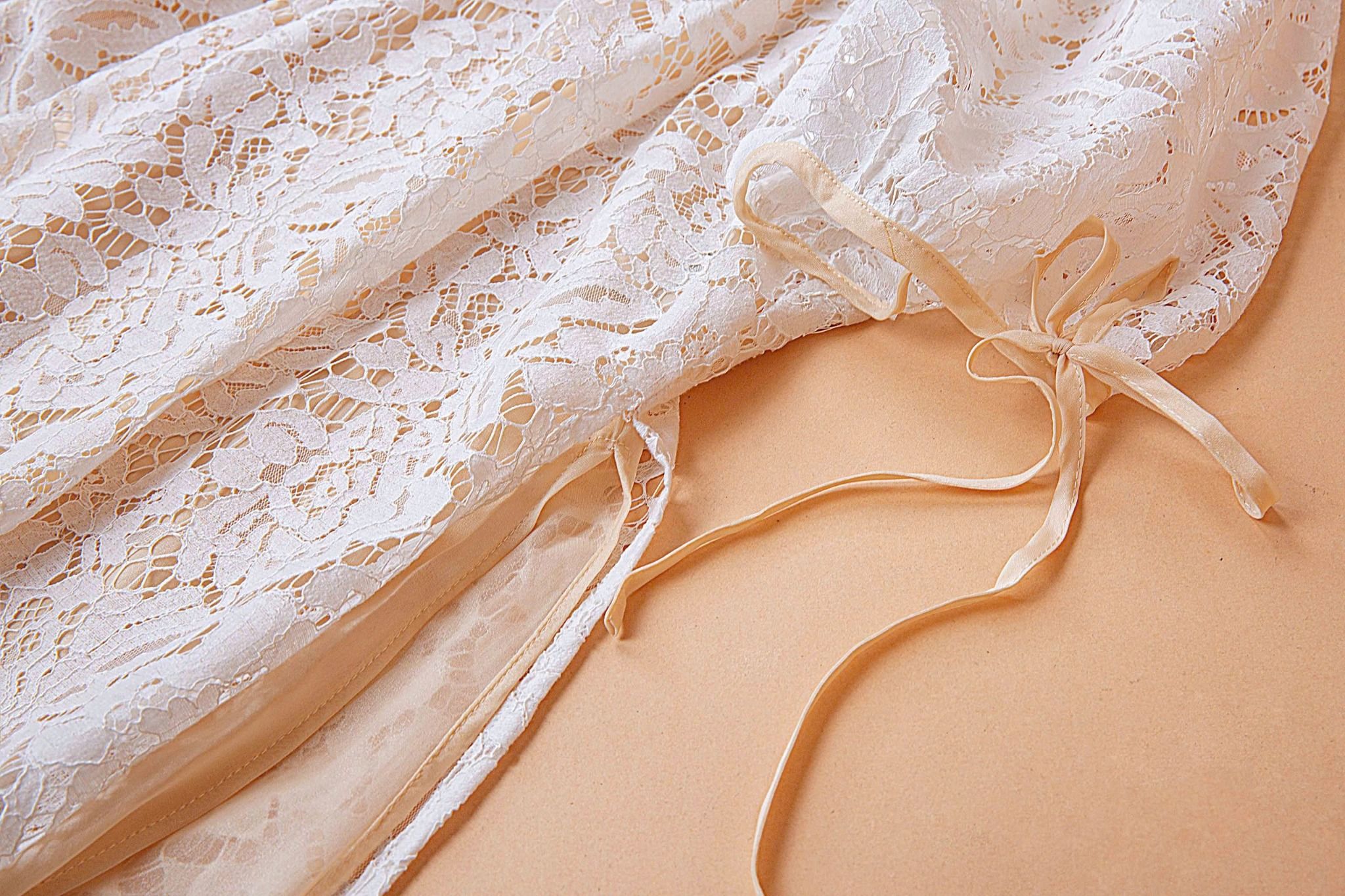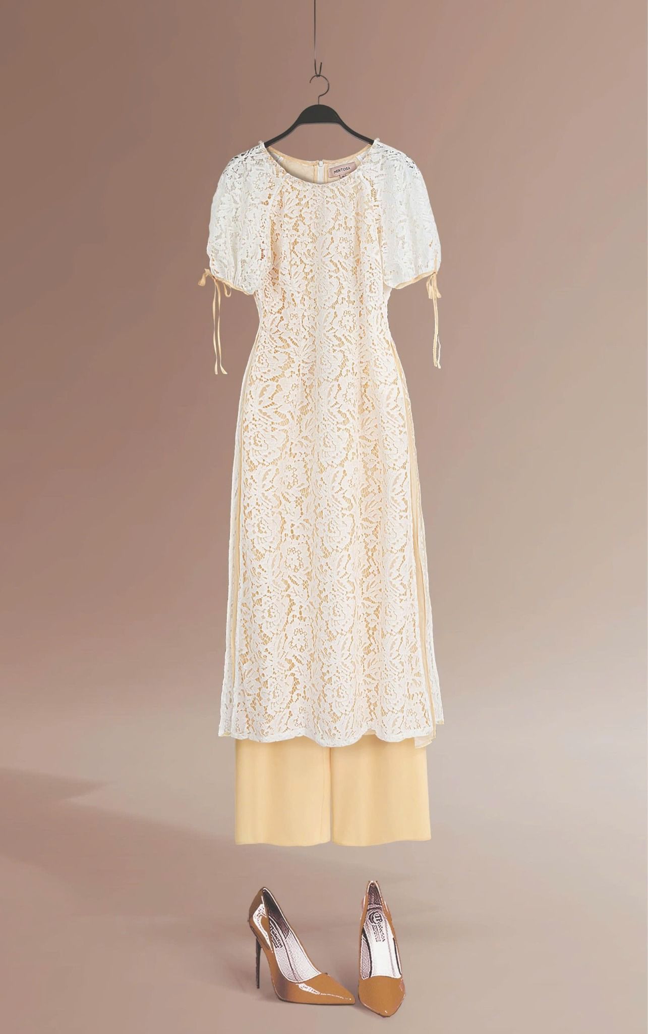 - Kiểu dáng: Áo dài ren đính kết ngọc trai thủ công tay áo phồng nhẹ quần thiết kế độc quần