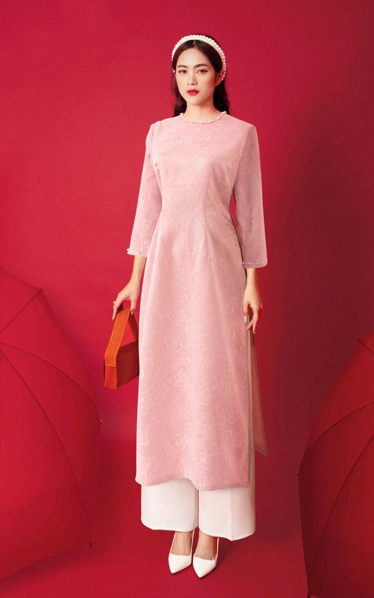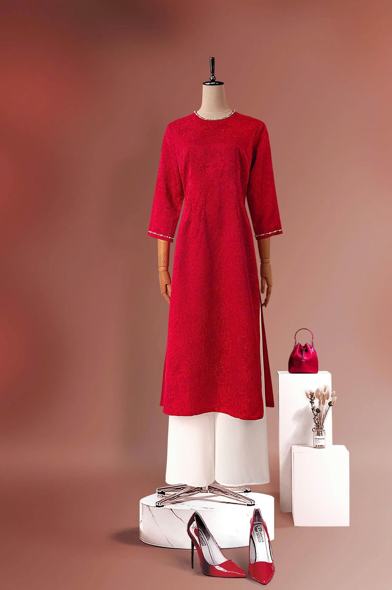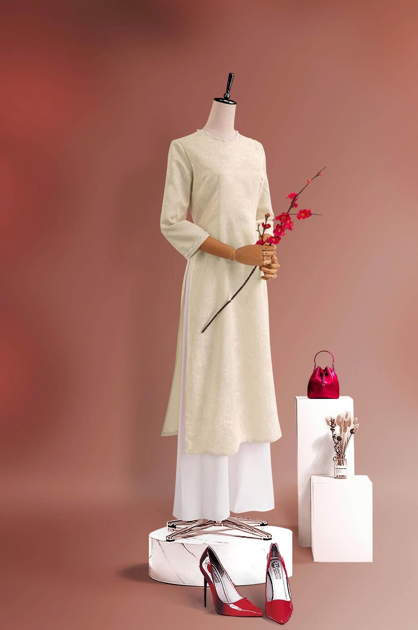 - Kiểu dáng: Áo dài cách tân, hoa văn gấm nổi đính kết thủ công 100%