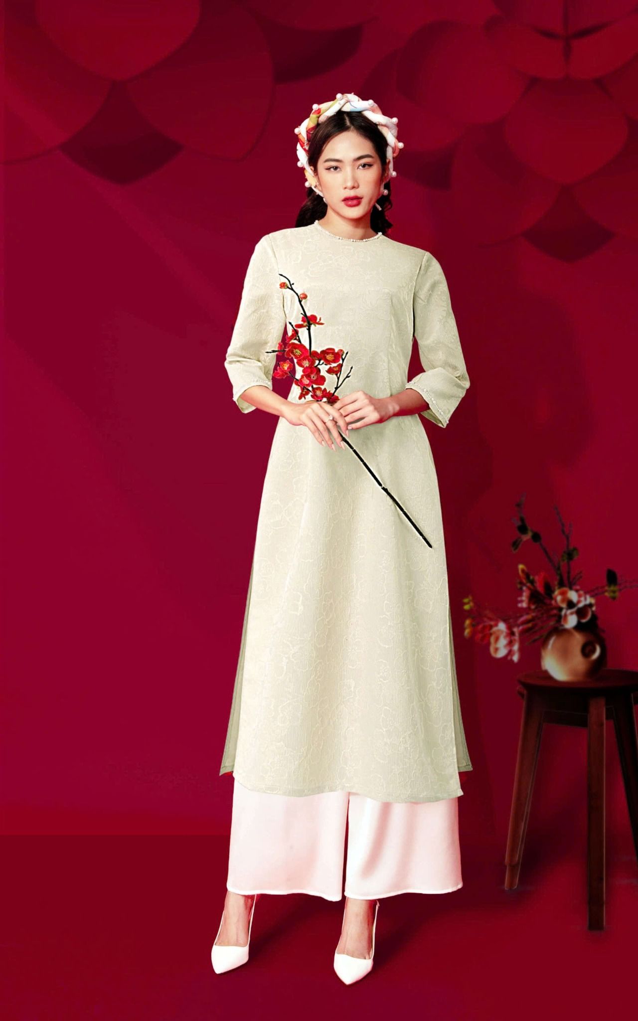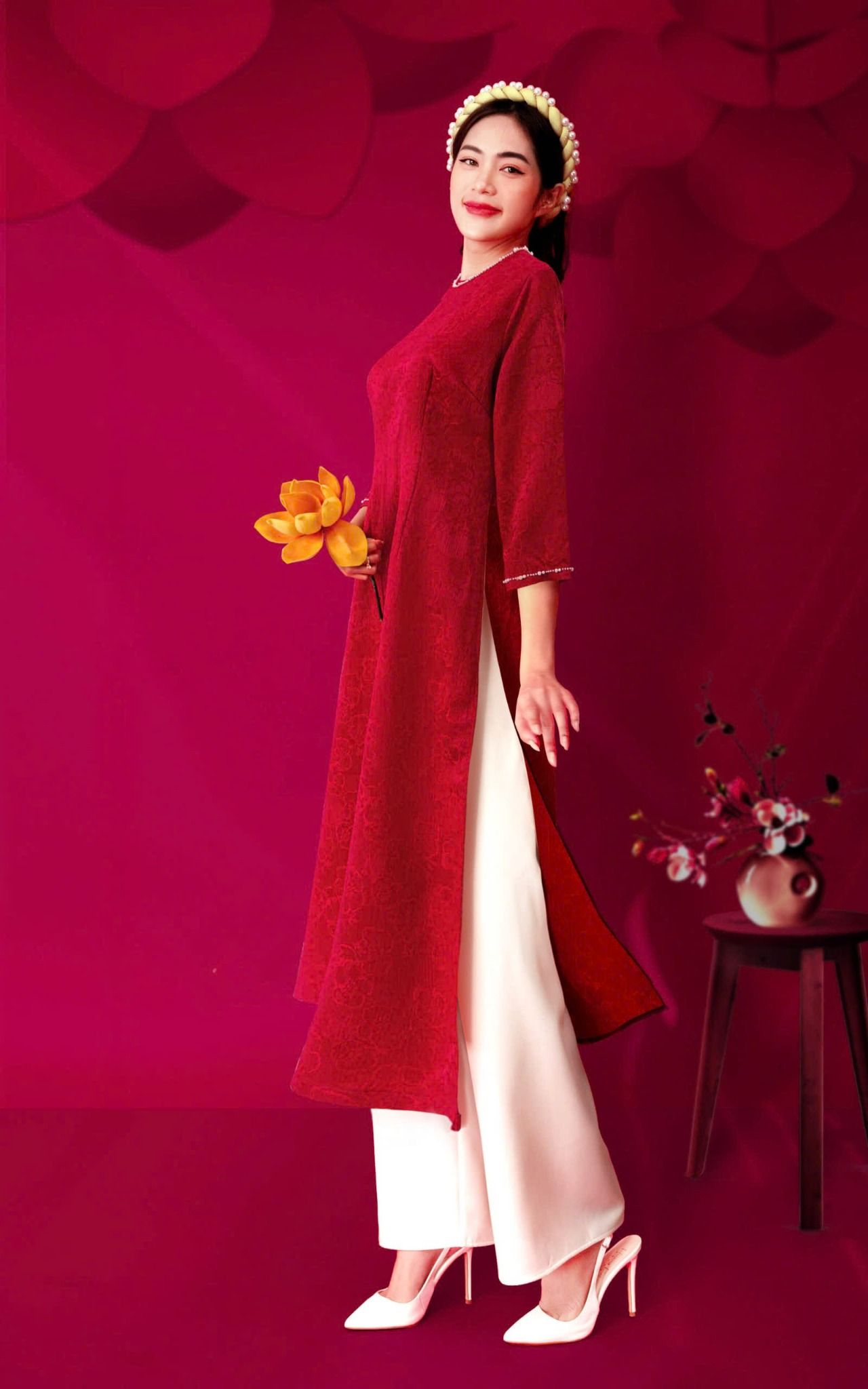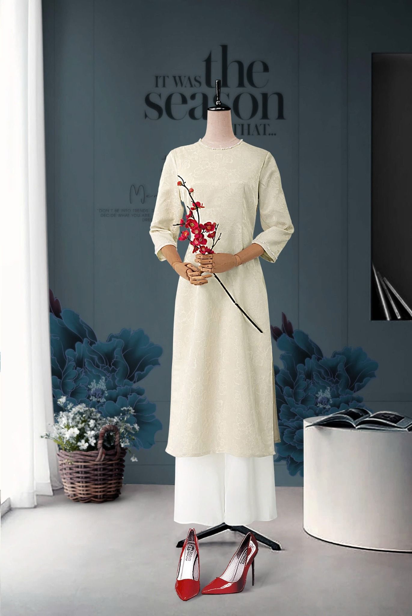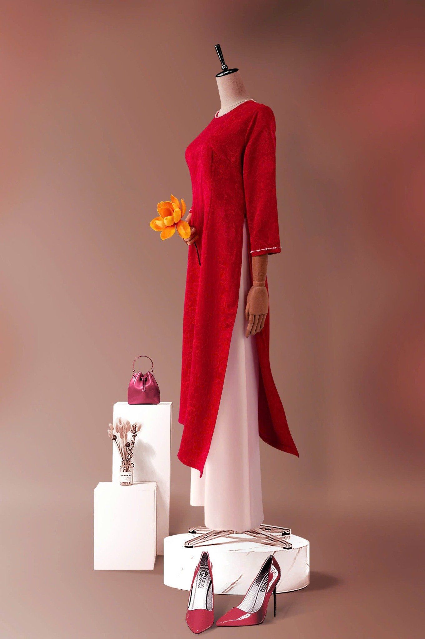 - Kiểu dáng: Áo dài cách tân, hoa văn gấm nổi đính kết thủ công 100%
