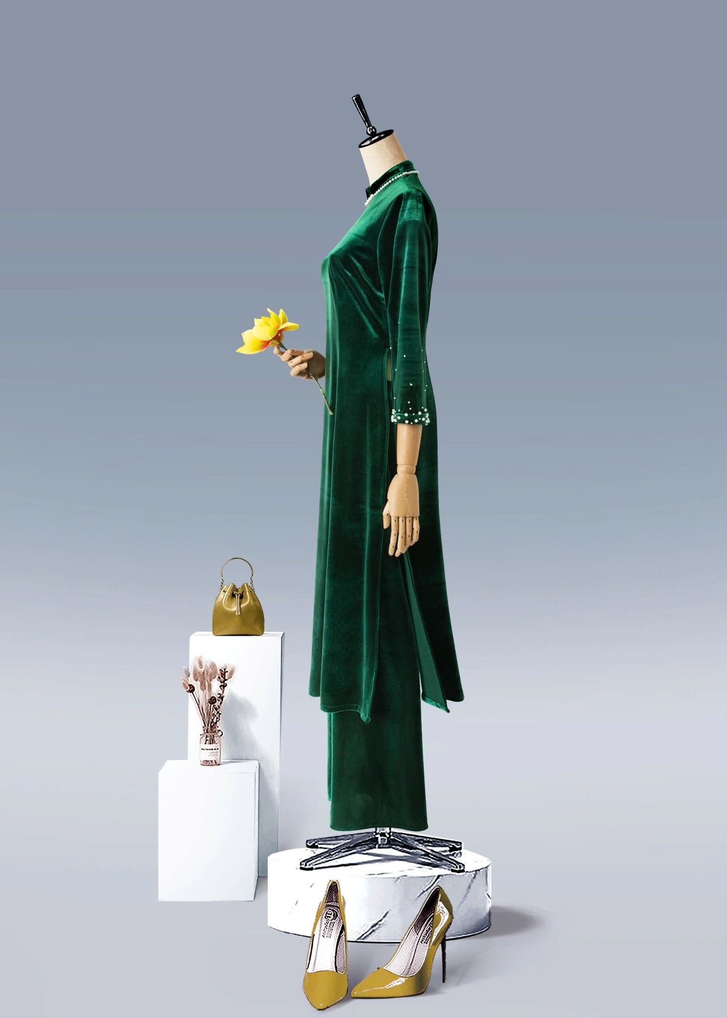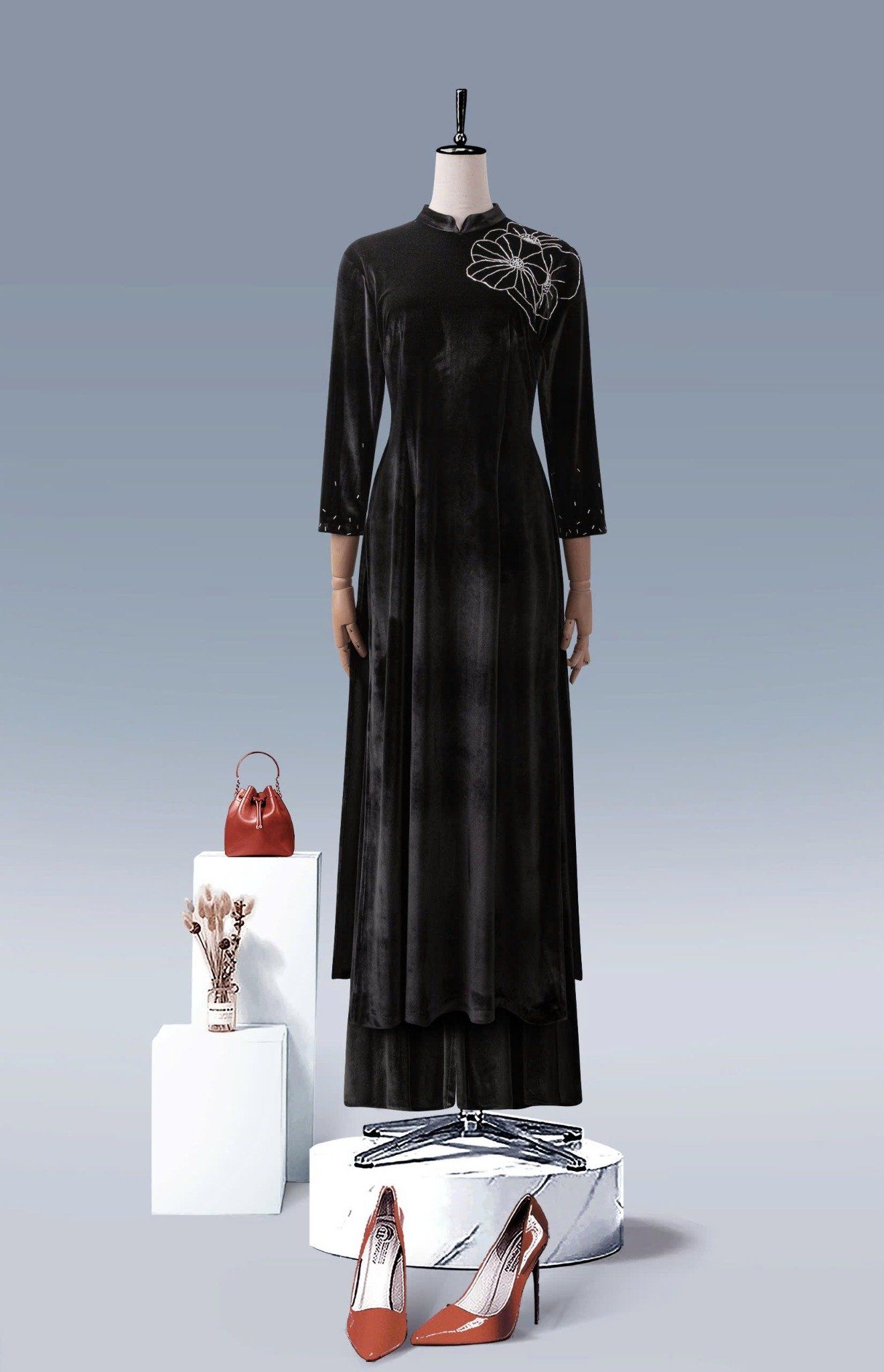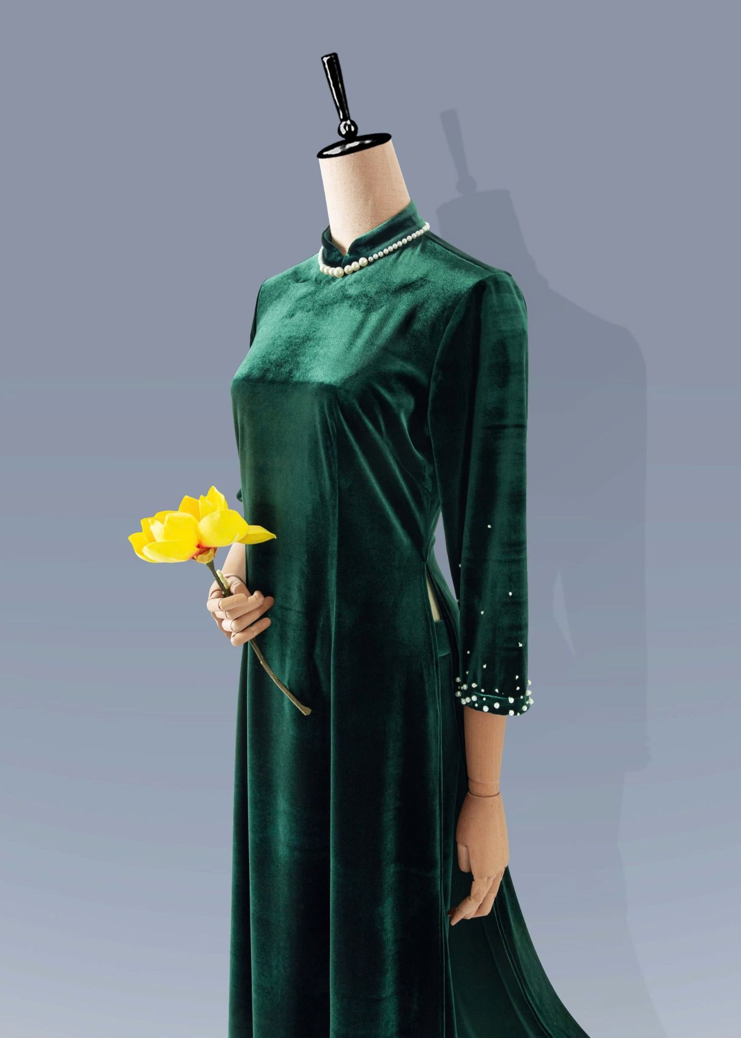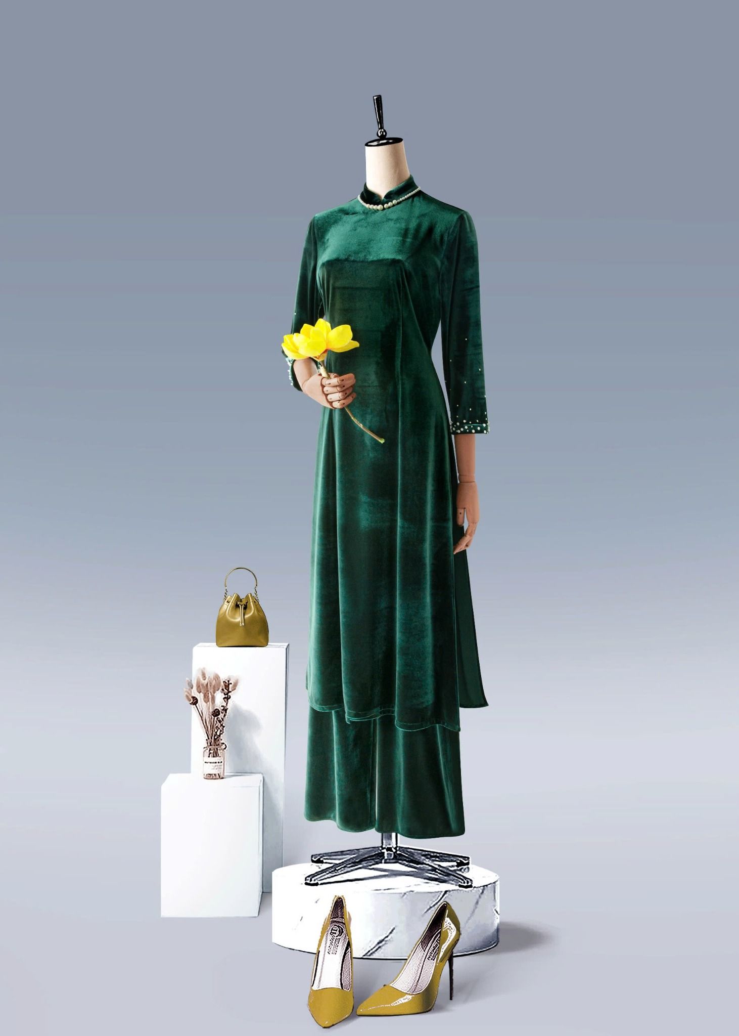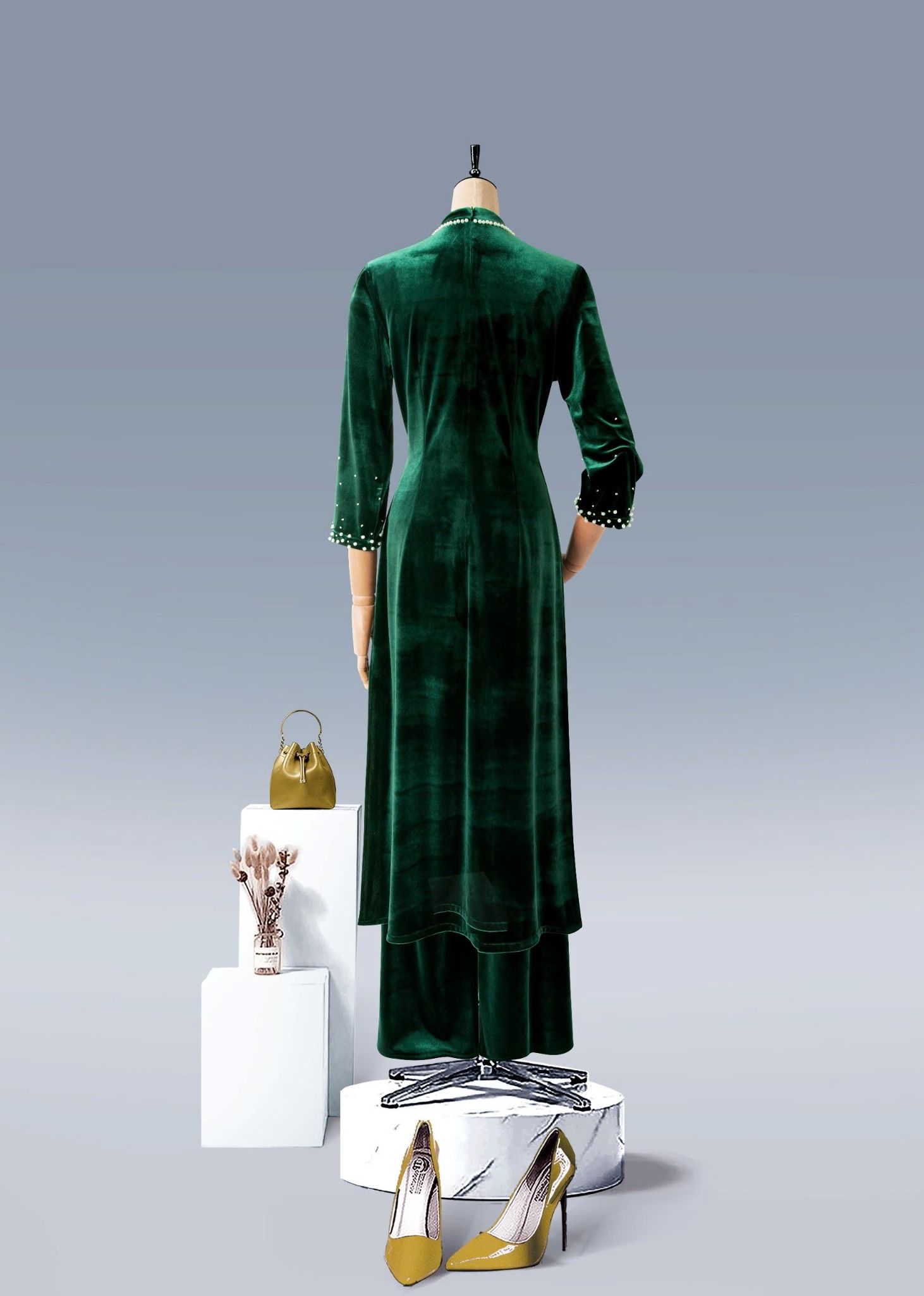 - Màu sắc: bộ áo dài nhung xanh, bộ áo dài nhung đen