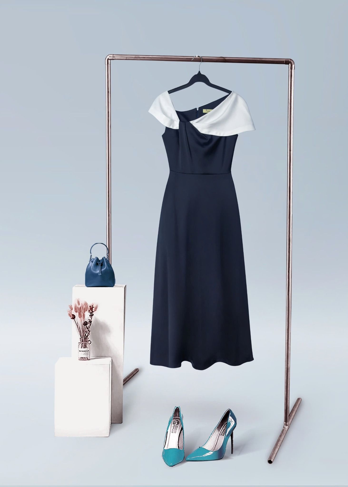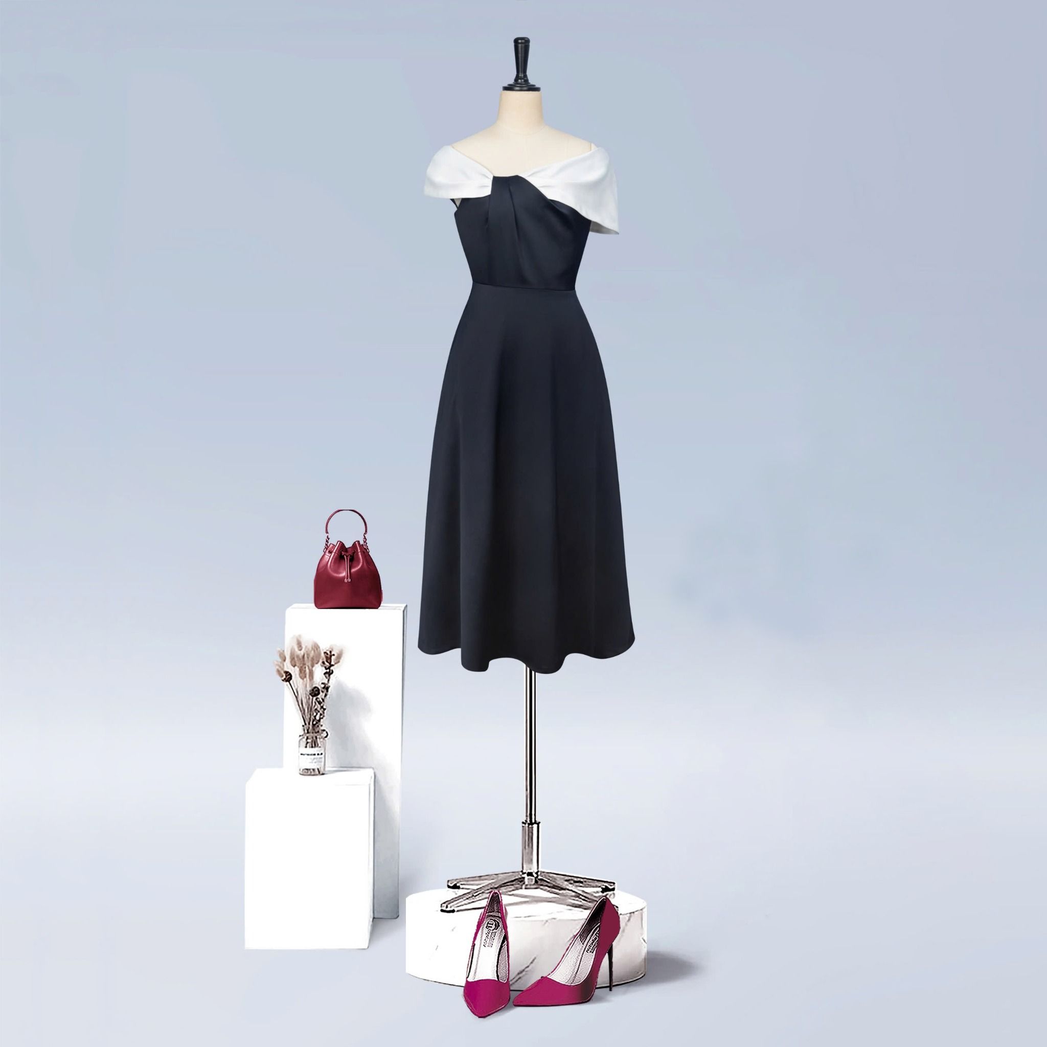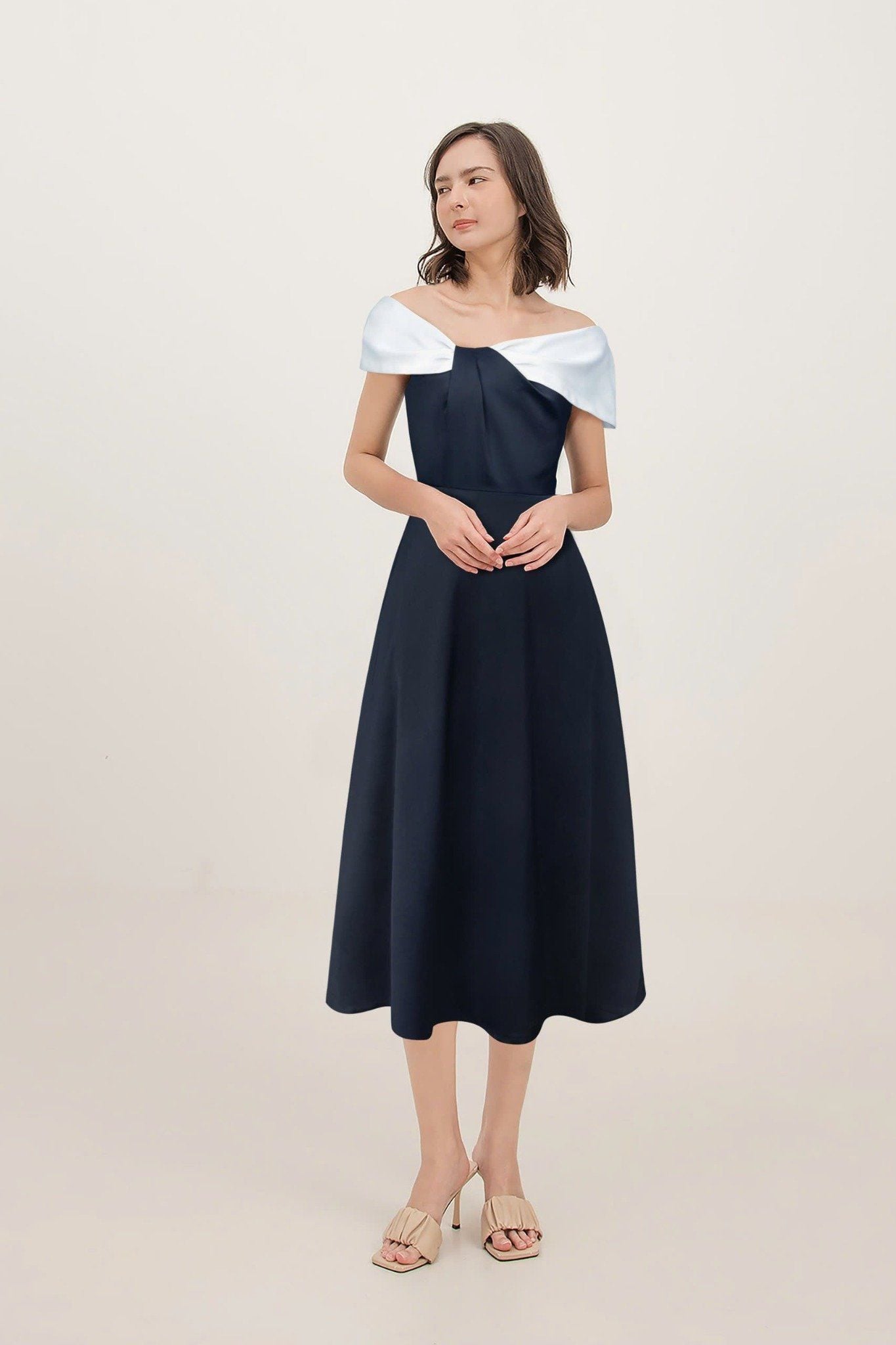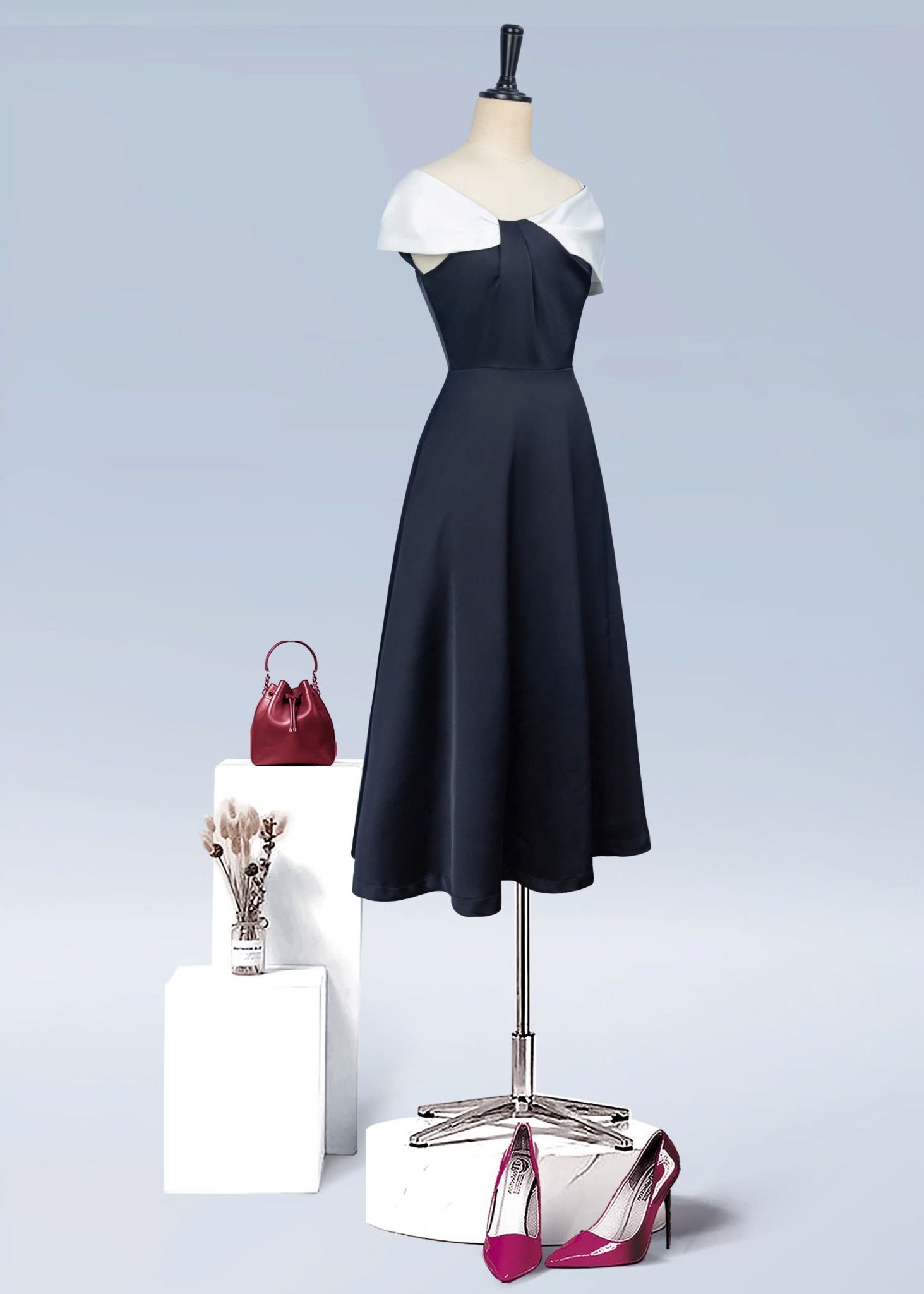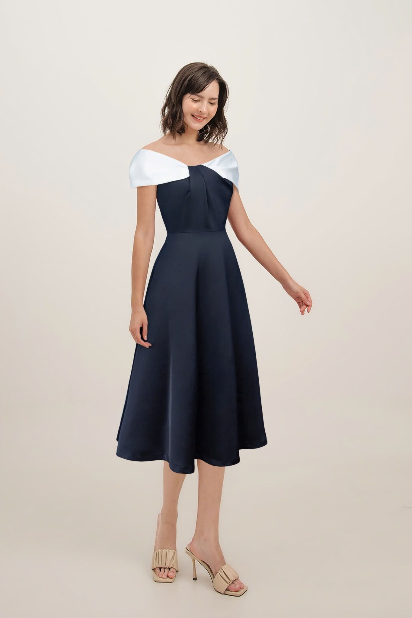 - Kiểu dáng: Đầm dáng xoè, xếp ly trễ vai