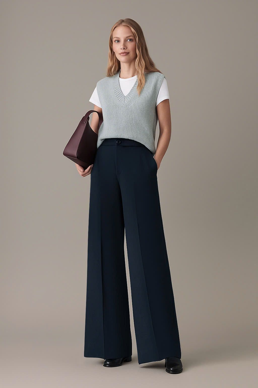 - Kiểu dáng: quần cạp cao, ống rộng