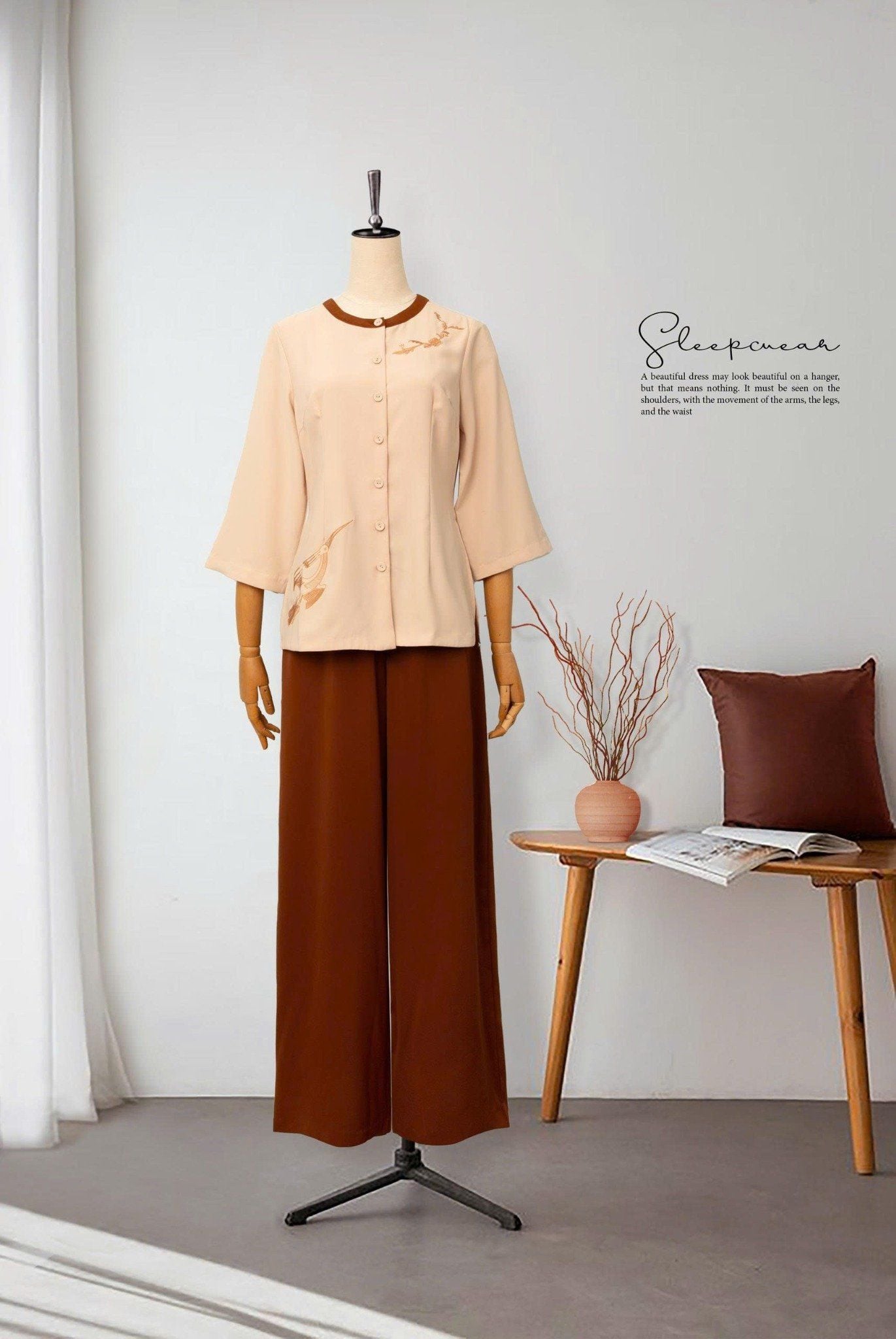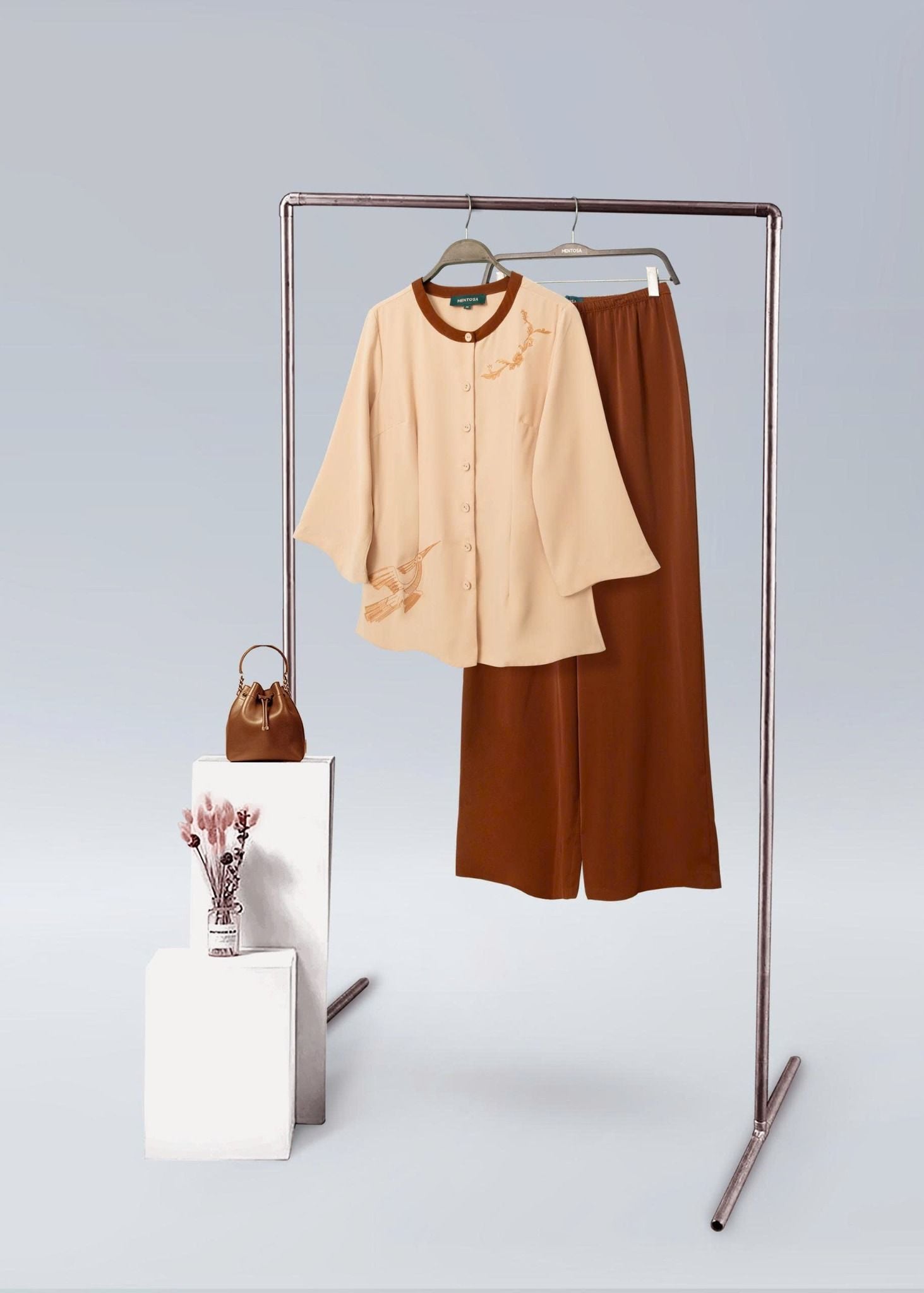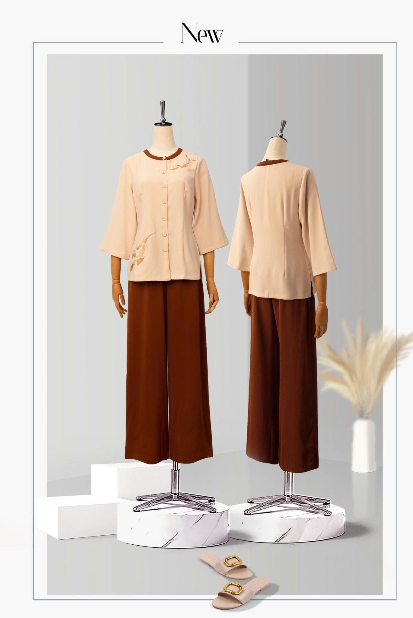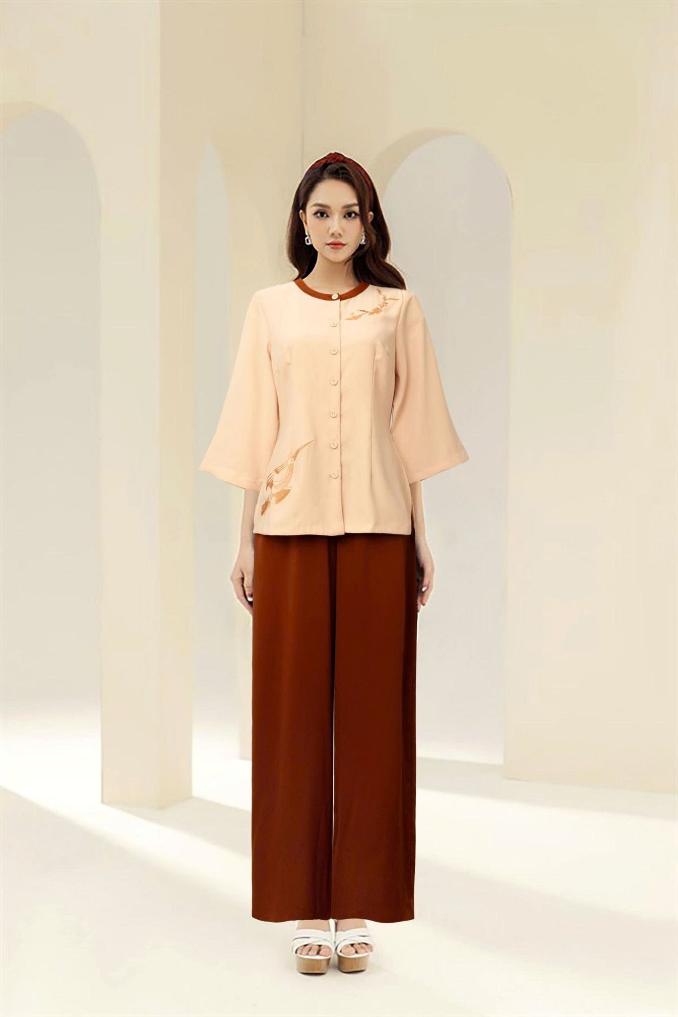 - Kiểu dáng: Áo cổ tròn, tay lửng, form ôm, quần dài, ống rộng, lưng thun